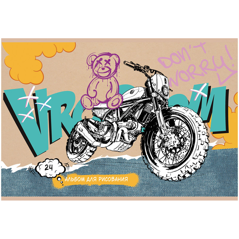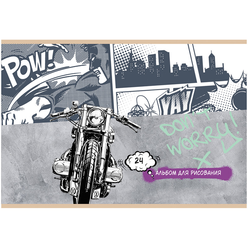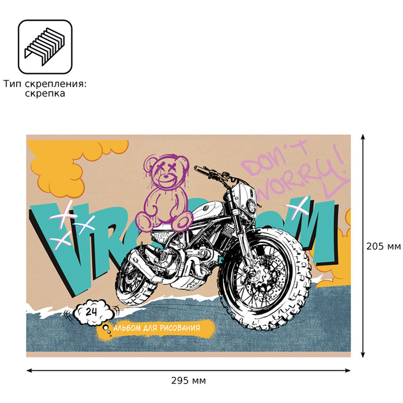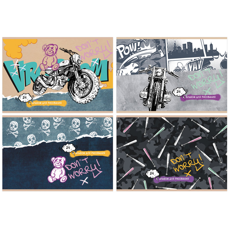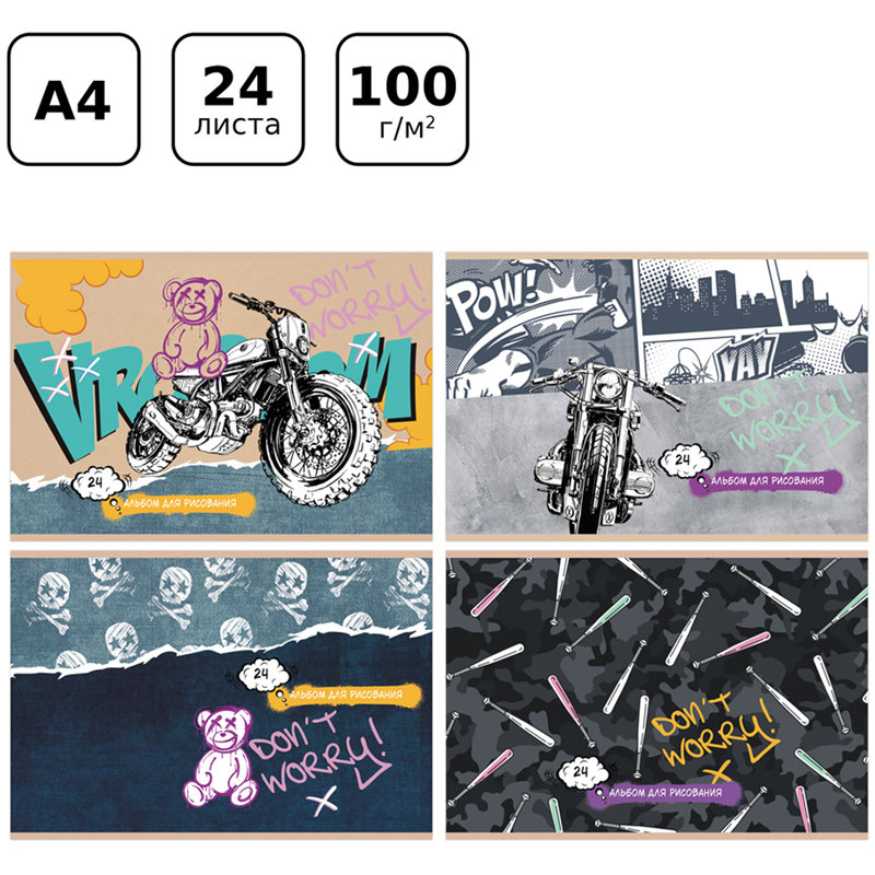 Альбом для рисования BG Don't worry А4, размер 205*295 мм. Альбом с обложкой из высококачественного мелованного картона состоит из 24 листов офсетной бумаги 100% белизны. Тип скрепления изделия – скрепка. Плотность бумаги альбома составляет 100 г/м2, что соответствует техническому регламенту «О безопасности продукции, предназначенной для детей и подростков». Альбом с мужским дизайном отлично подходит для рисования различными типами красок, фломастерами, цветными и черно-графитными карандашами, гелевыми ручками. Без возрастных ограничений.