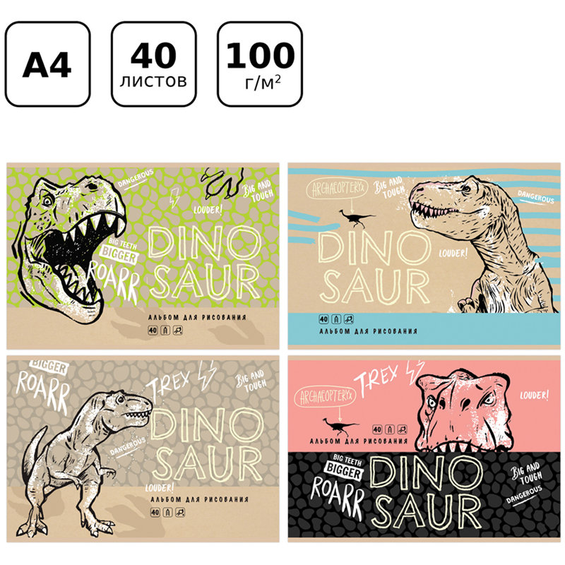 Альбом для рисования BG Dinosaur А4, размер 205*295 мм. Альбом с обложкой из высококачественного мелованного картона состоит из 40 листов офсетной бумаги 100% белизны. Тип скрепления изделия – скрепка. Плотность бумаги альбома составляет 100 г/м2, что соответствует техническому регламенту «О безопасности продукции, предназначенной для детей и подростков». Альбом с мужским дизайном отлично подходит для рисования различными типами красок, фломастерами, цветными и черно-графитными карандашами, гелевыми ручками. Без возрастных ограничений.