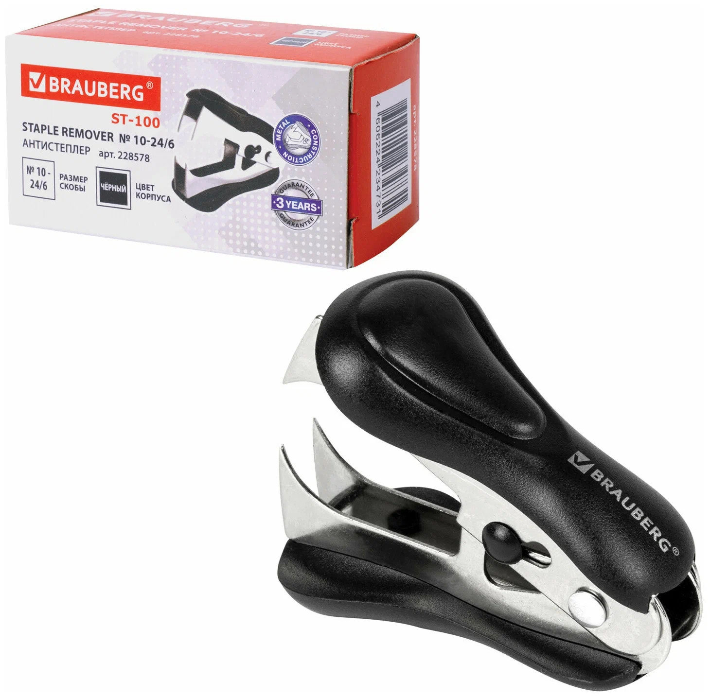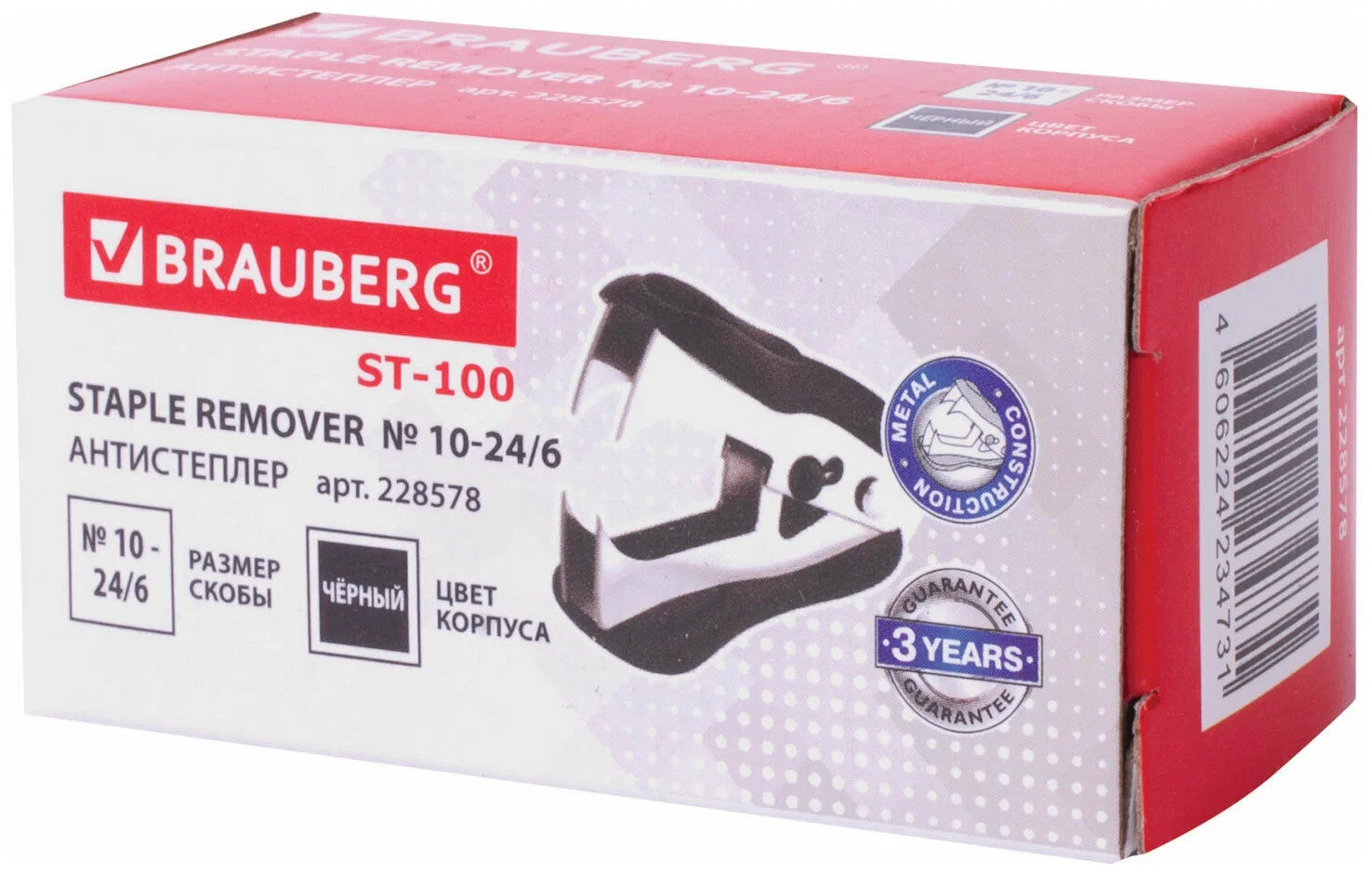 Рабочий механизм антистеплера выполнен из металла, корпус — из пластика черного цвета. Наличие фиксатора обеспечивает удобное хранение в закрытом положении.