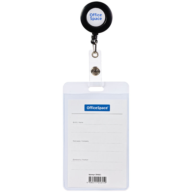 Бейдж вертикальный из мягкого прочного пластика с держателем-рулеткой. Позволяет разместить бейдж на поясе, ремне.
