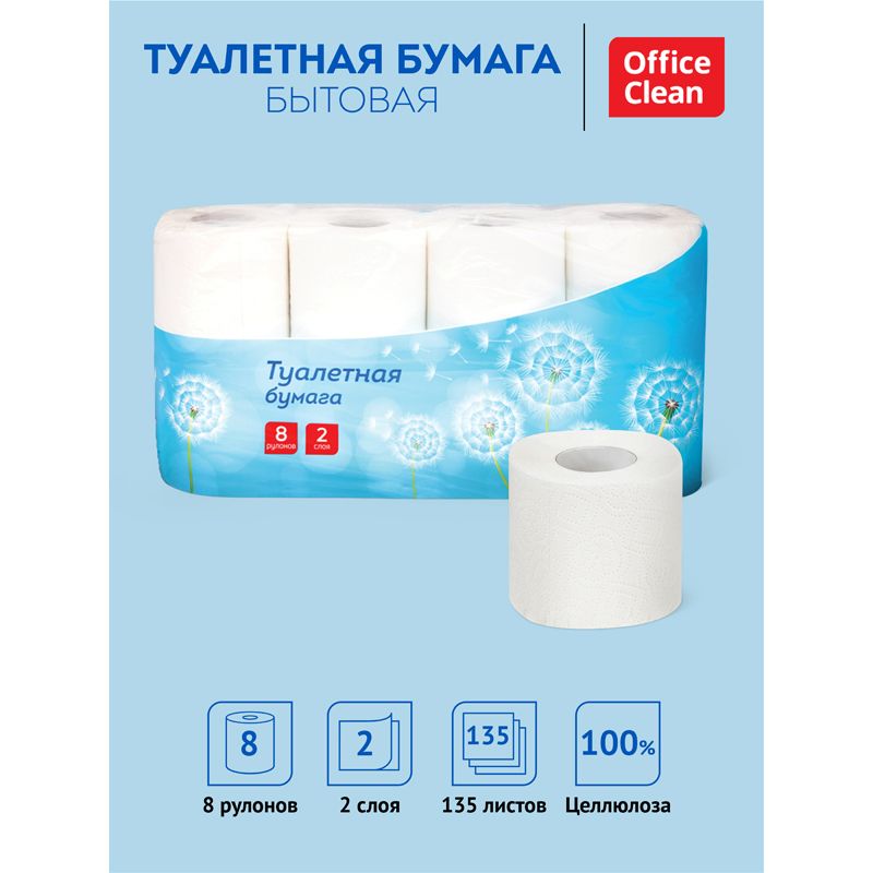 Туалетная бумага двухслойная «OfficeClean» белого цвета, состав сырья: 100% целлюлоза, с перфорацией и тиснением. 8 рулонов в неделимой упаковке. Показатели качества и безопасности соответствуют требованиям ГОСТ Р 52354-2005.