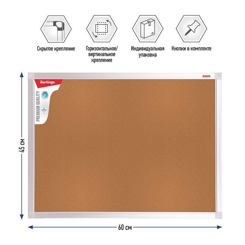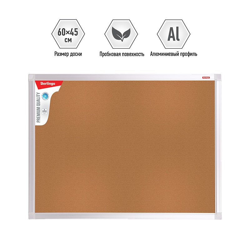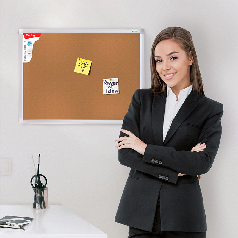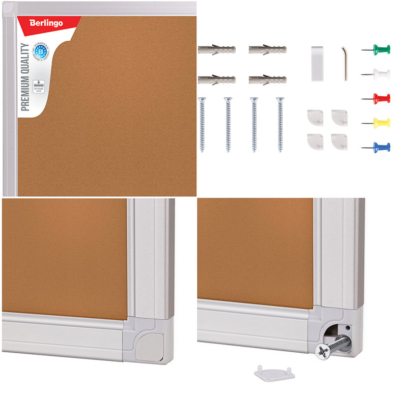 Доска пробковая с качественным покрытием, в элегантной рамке из алюминиевого профиля. Изготовлены c использованием наполнителя "Softboard", что придает дополнительную прочность в процессе перевозки и хранения, а также износостойкость в процессе эксплуатации. Предназначена для размещения информационных материалов с помощью силовых кнопок. В комплект входит набор креплений и силовые кнопки.