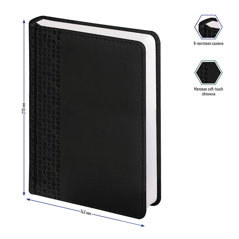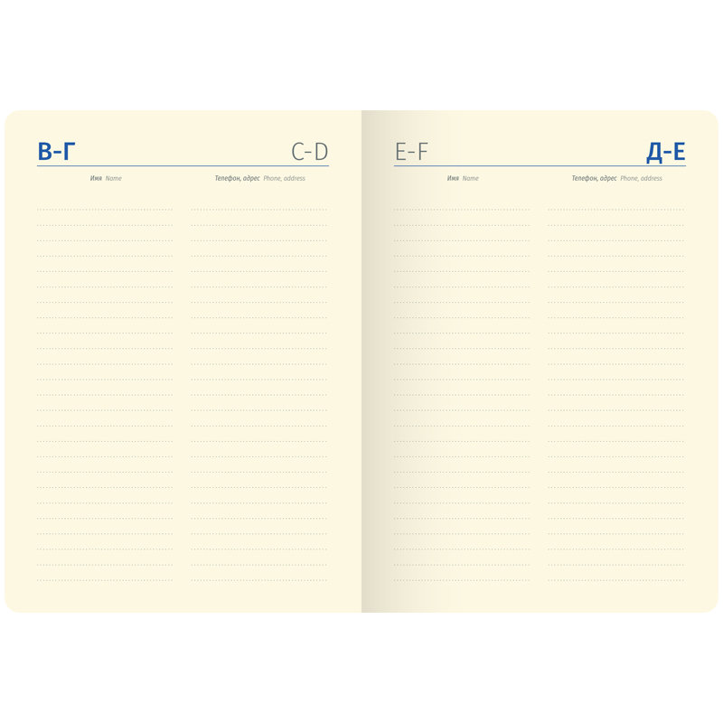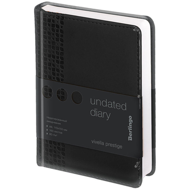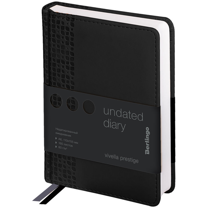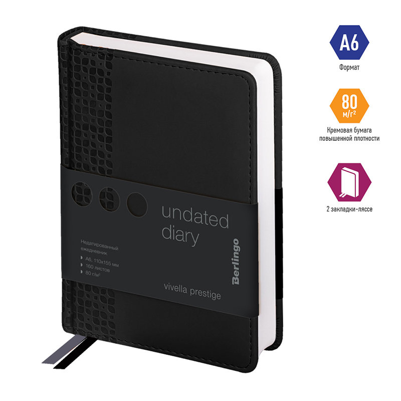 Внутренний блок состоит из 160 листов высококачественной белой бумаги повышенной плотности 80 г/м² с пантонной печатью в 2 краски. Недатированный ежедневник Berlingo Vivella Prestige представлен в размере 110 на 155 мм.