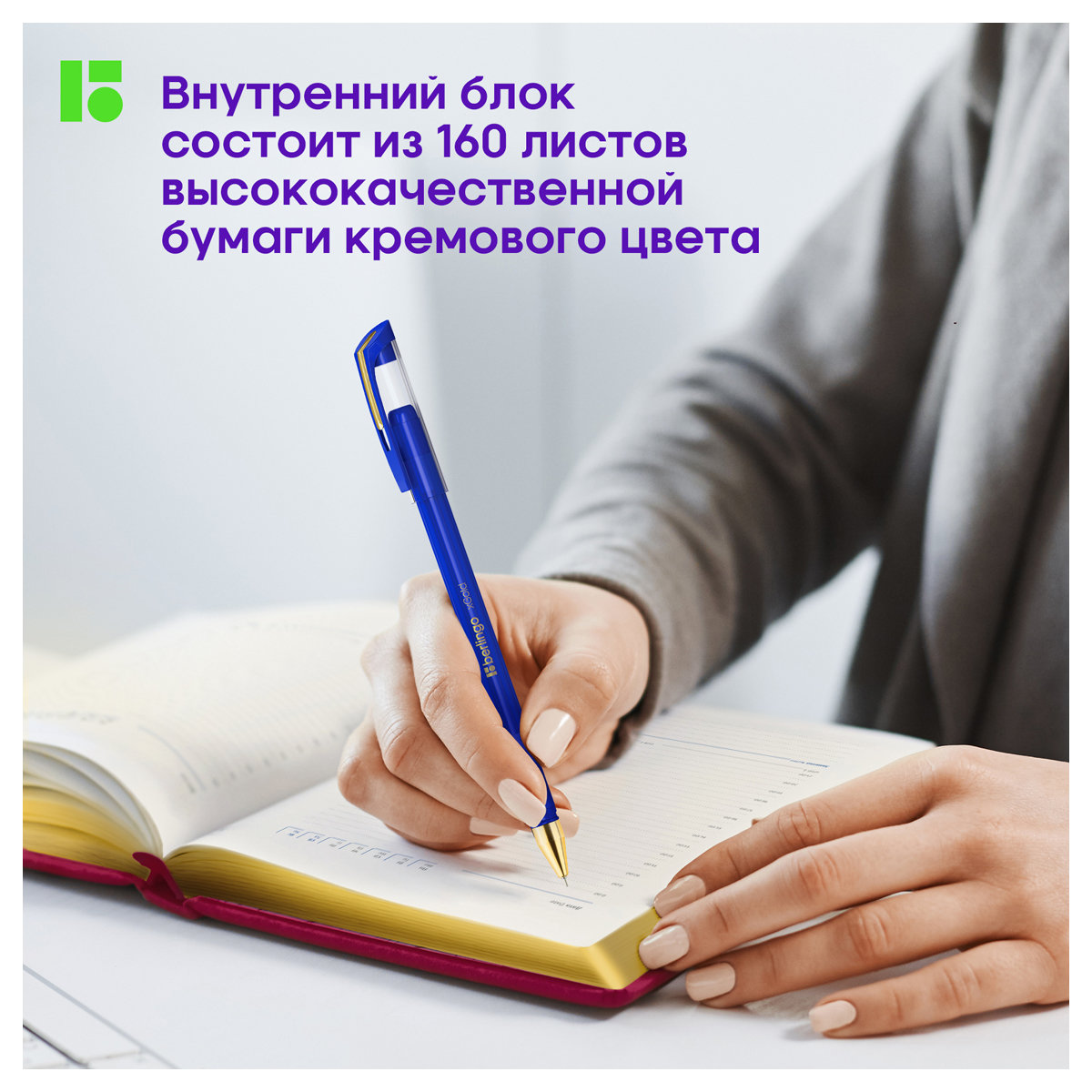 Внутренний блок состоит из 160 листов высококачественной кремовой бумаги повышенной плотности 80 г/м² с пантонной печатью в 2 краски.