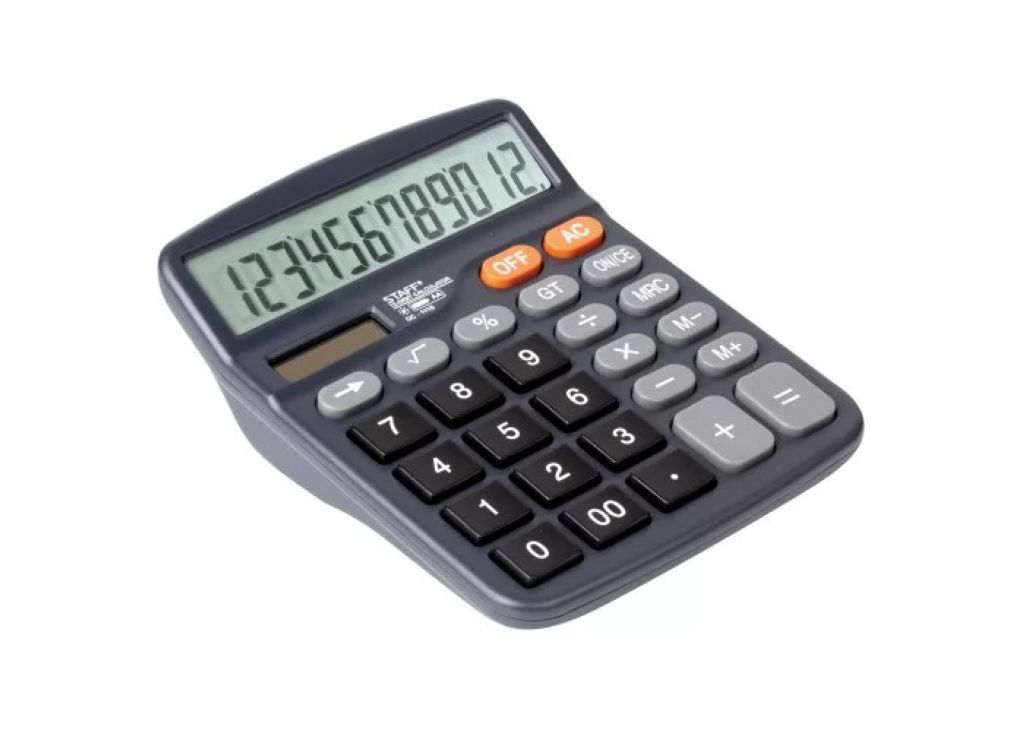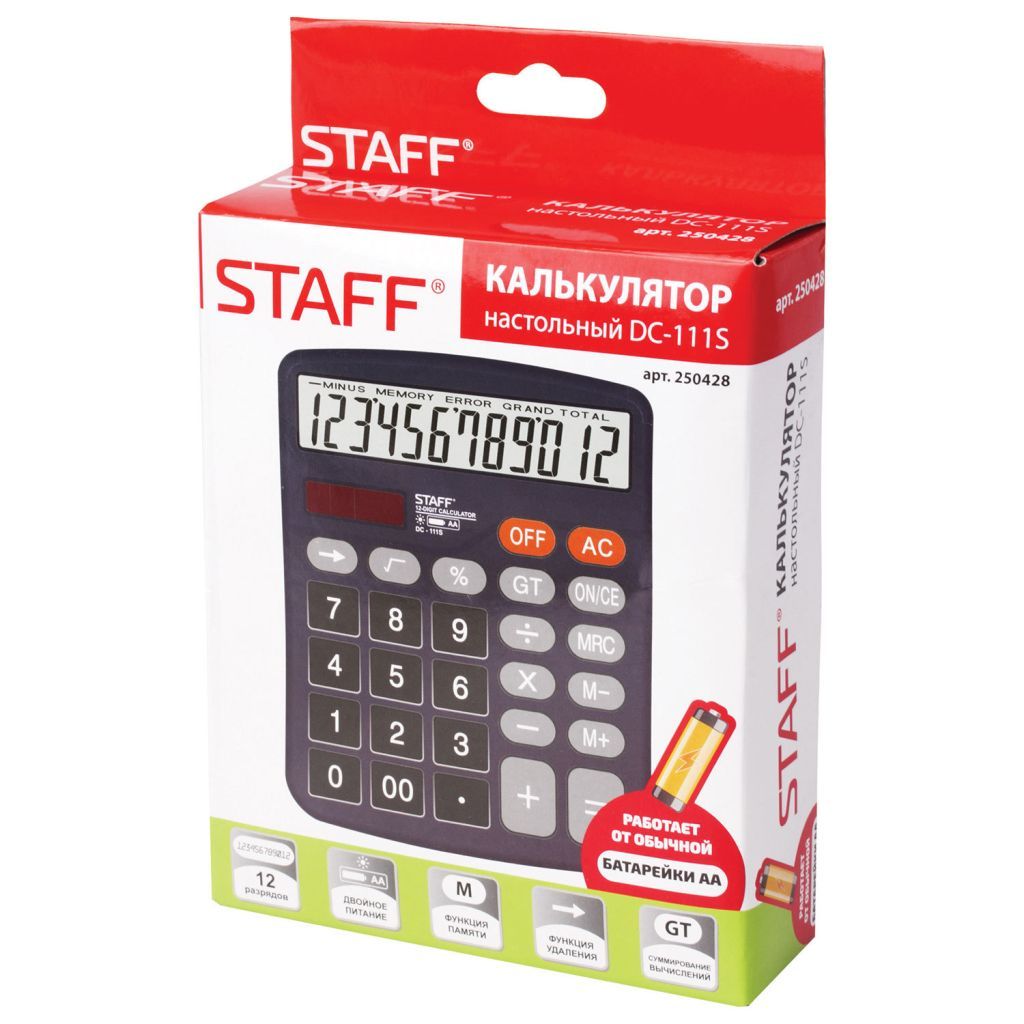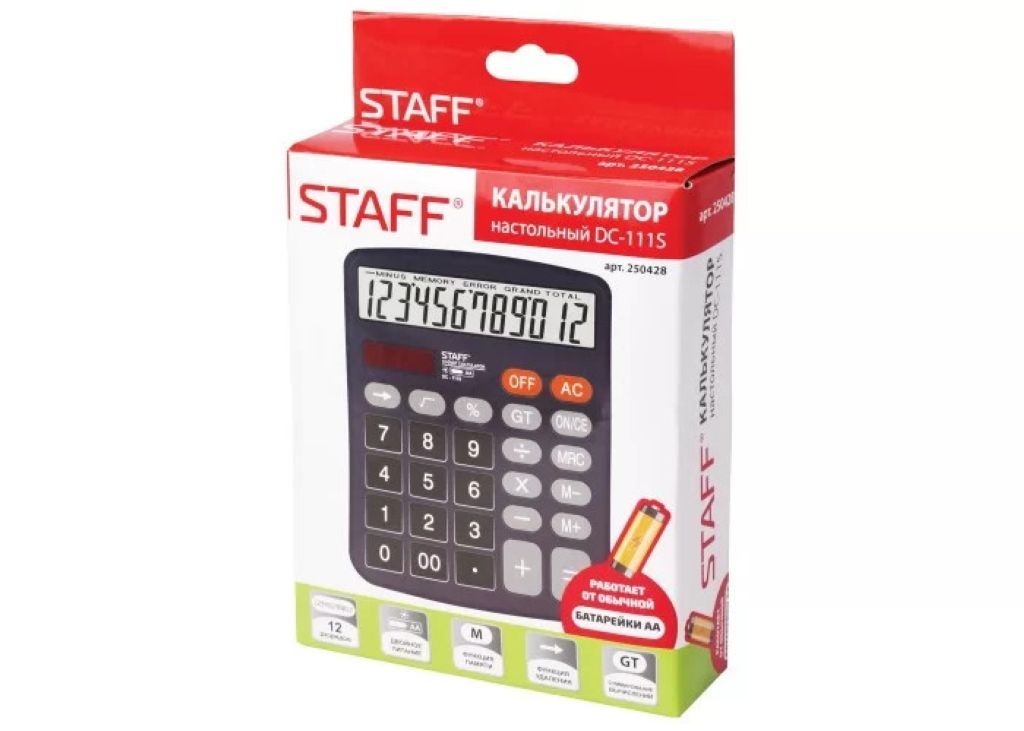 Настольный калькулятор имеет функцию суммирования вычисления, функцию расчета наценки, ограничения количества знаков после запятой и клавишу корректировки последнего знака, клавишу "Два нуля". Работает от обычной батарейки AA.