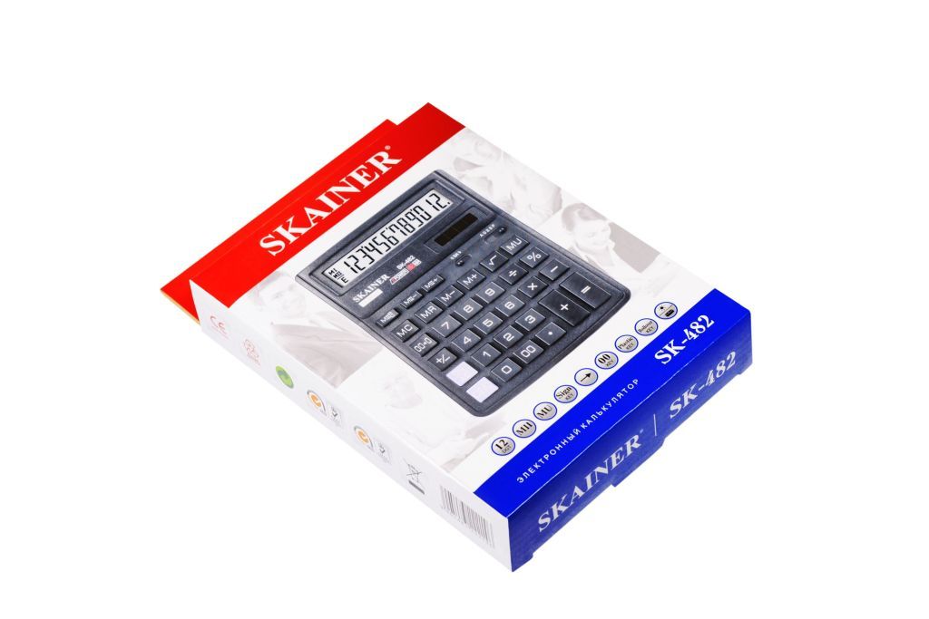 Калькулятор "SKAINER" в пластиковом корпусе черного цвета с 12-разрядным ЖК-дисплеем. Позволяет задавать настройки округления и количества знаков после запятой. Калькулятор имеет оптимальный набор вычислительных функций: основные математические операции, расчет процентов, извлечение квадратного корня, запоминание промежуточных результатов. Удобная клавиатура снабжена кнопкой ввода двойного нуля. Питание калькулятора автоматически отключается после пяти минут бездействия. В калькуляторе имеется два питания: солнечная батарея + батарейка таблетка. Автоматическое выключение питания.