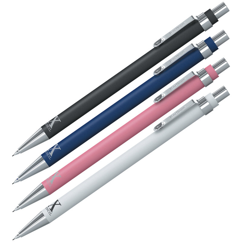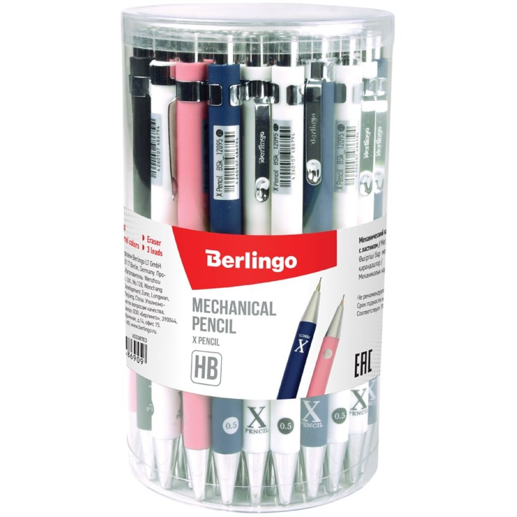 Механический карандаш с металлическим клипом и хромированным элементами. Отличается элегантным дизайном. Корпус с покрытием soft touch выполнен в четырёх стильных цветах – чёрном, белом, тёмно-синем и розовом. 40 штук в пластиковом стакане. Диаметр грифеля - 0,5 мм. Твёрдость - HB. Снабжён двумя запасными грифелями и встроенным ластиком. Материал корпуса – прорезиненный пластик. Направляющий механизм грифеля выполнен из металла. Подача грифеля осуществляется с помощью кнопочного механизма.