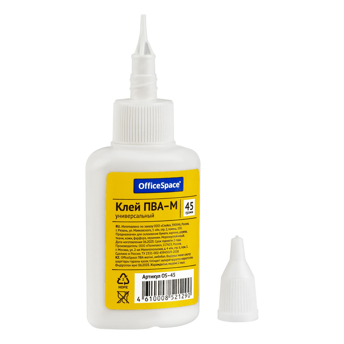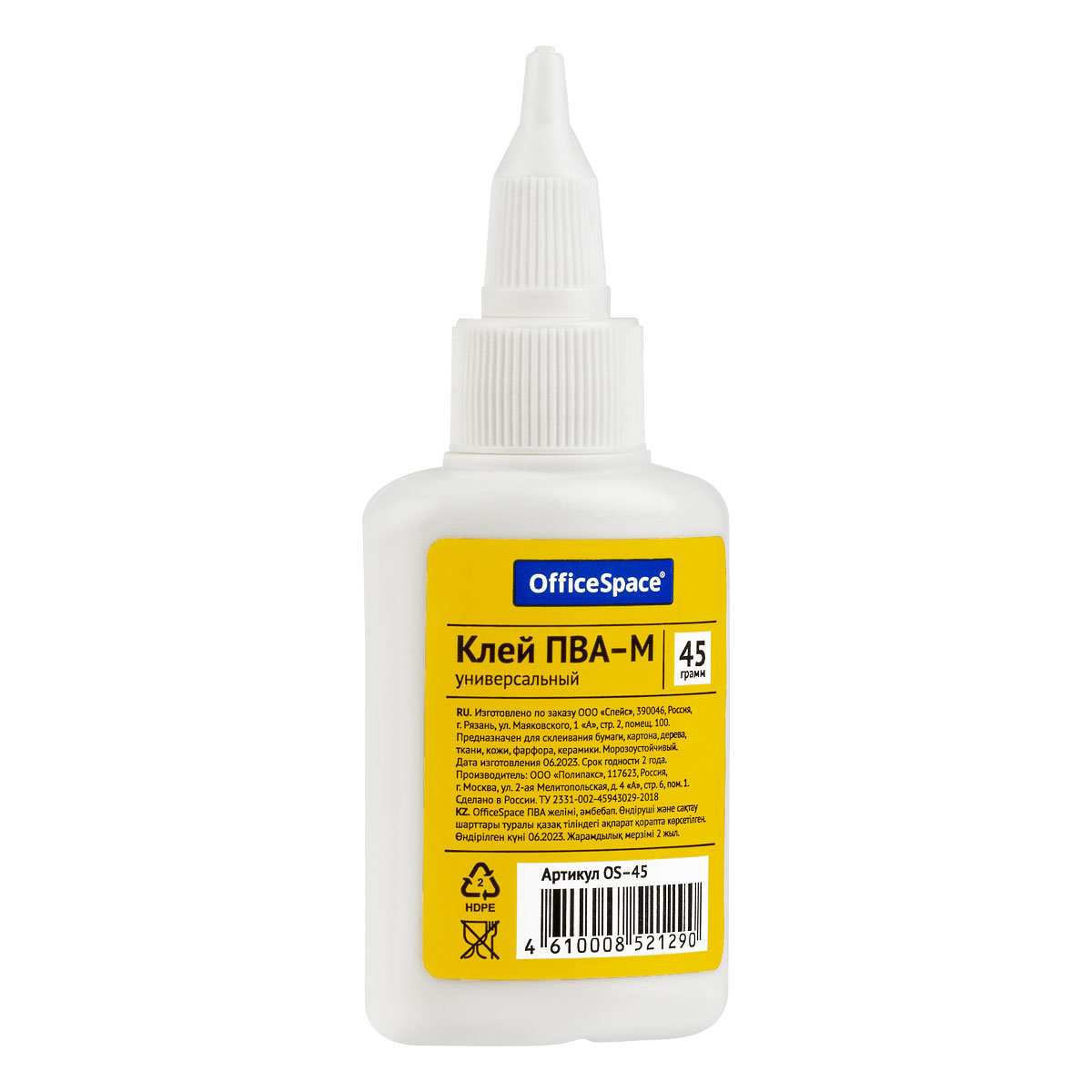 Клей для бумаги и картона ПВА OfficeSpace предназначен для склеивания бумаги, картона, дерева. Флакончик с дозатором.