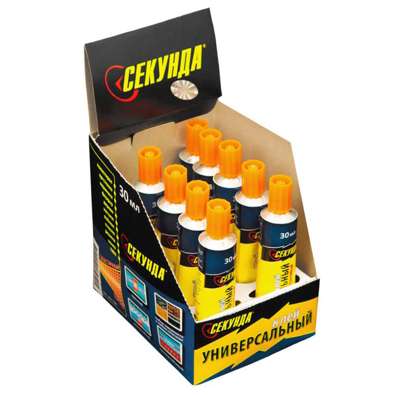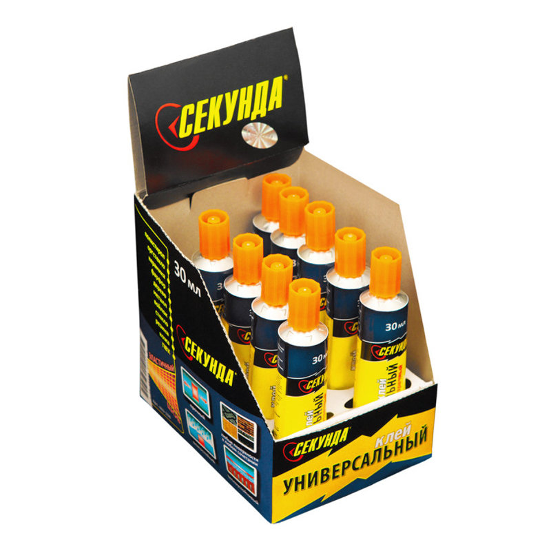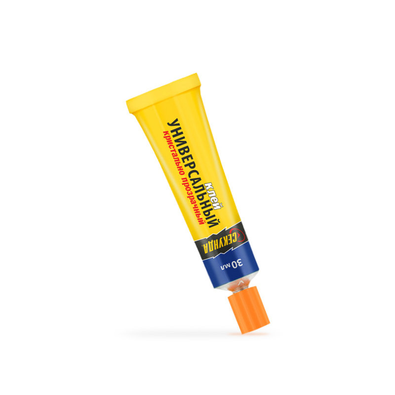 Универсальный прозрачный клей «Секунда» состоит из полиуретана, ацетона, этилоксалата и других компонентов. Применяется для соединения в различных сочетаниях дерева, металла, мягкого и жесткого ПВХ, полистирола, оргстекла, резины, войлока, кожи, фарфора, керамики, стекла.Тюбик содержит 30 мл универсального клея.