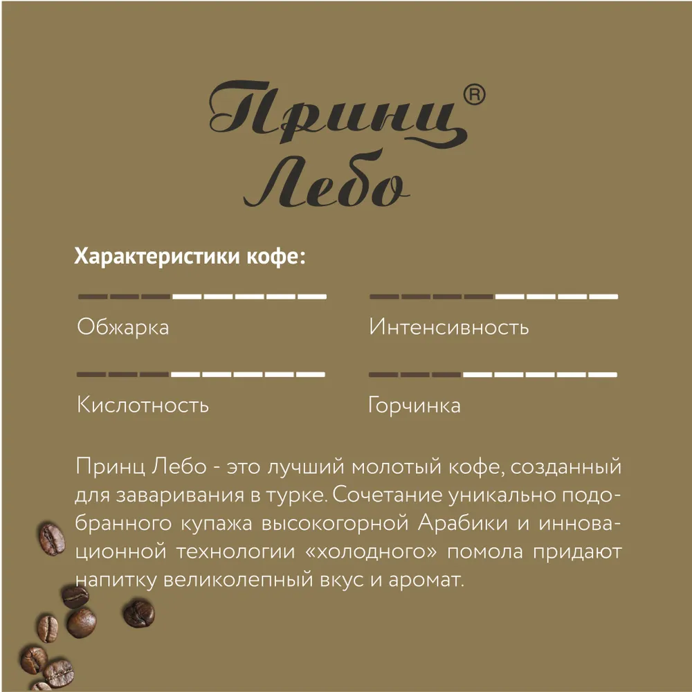 Молотый кофе ПРИНЦ ЛЕБО не просто завоевал сердца многих гурманов, но по достоинству оценен лучшими кофейными специалистами России. Его непревзойденные вкус и аромат доступны каждому желающему открыть для себя неповторимый купаж с легкими фруктовыми нотами. Его тонкий помол идеально подойдет для приготовления кофе в турке. Кофе ПРИНЦ ЛЕБО будет отлично согревать и поднимать настроение круглый год.