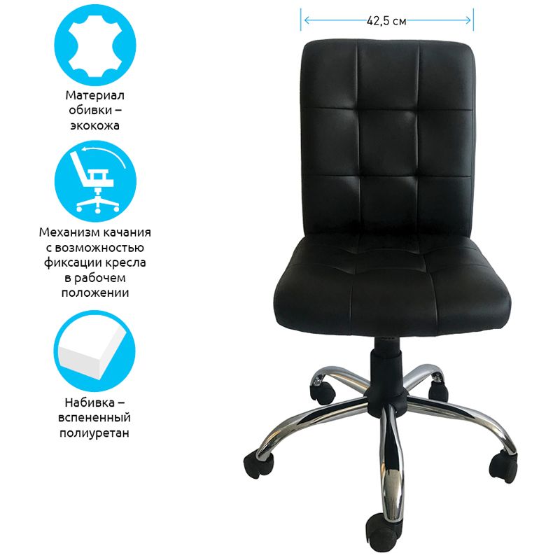 Максимальная нагрузка – 120 кг. Газпатрон 3 класса по стандарту BIFMA X5.1. Каркас – немонолитный, материал набивки – вспененный полиуретан, крестовина – хромированный металл, материал обивки – чёрная экокожа. Механизм качания топ-ган с возможностью фиксации кресла в рабочем положении. Гарантийный срок – 12 месяцев.