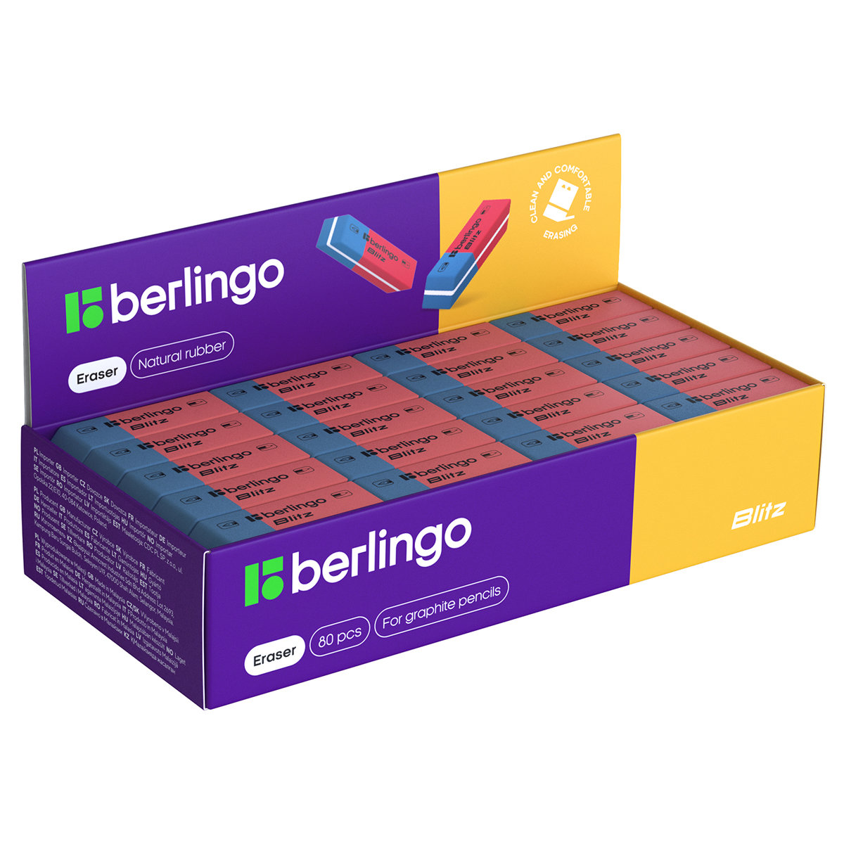 Ластик "Blitz" выполнен из натурального каучука. Идеально подходит для стирания карандаша и чернил. При стирании не повреждает бумагу и не оставляет грязных следов.