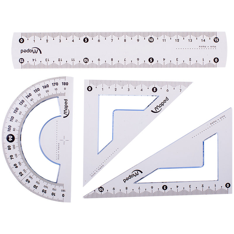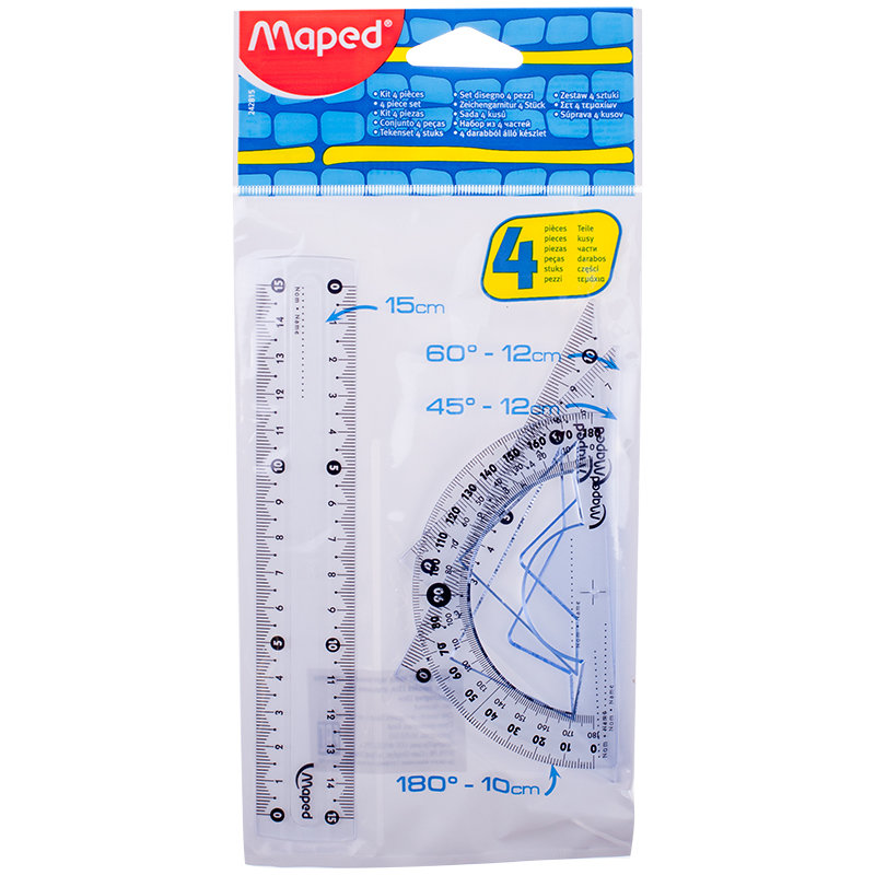 Набор чертежных инструментов включает четыре предмета: линейка с безопасными закруглёнными углами, два угольника, транспортир.
