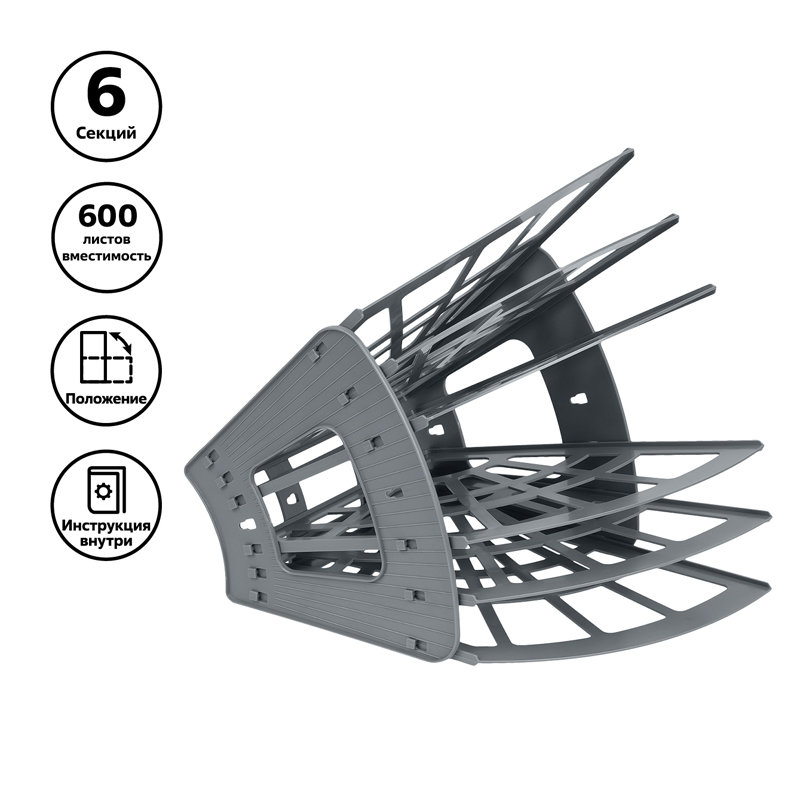 Лоток секционный 6 секций, 5 отделений для документации формата А4. Возможность горизонтального и вертикального расположения. Сборно-разборная, прочная, лёгкая конструкция. Конструкция позволяет регулировать ширину отделений. Экономичен при транспортировке и хранении.
