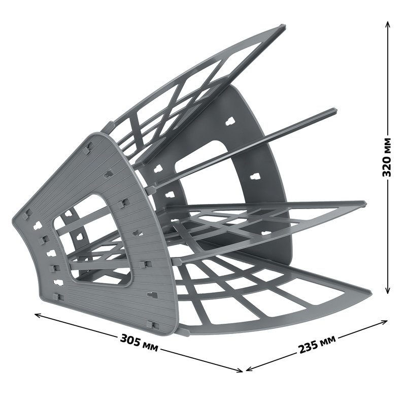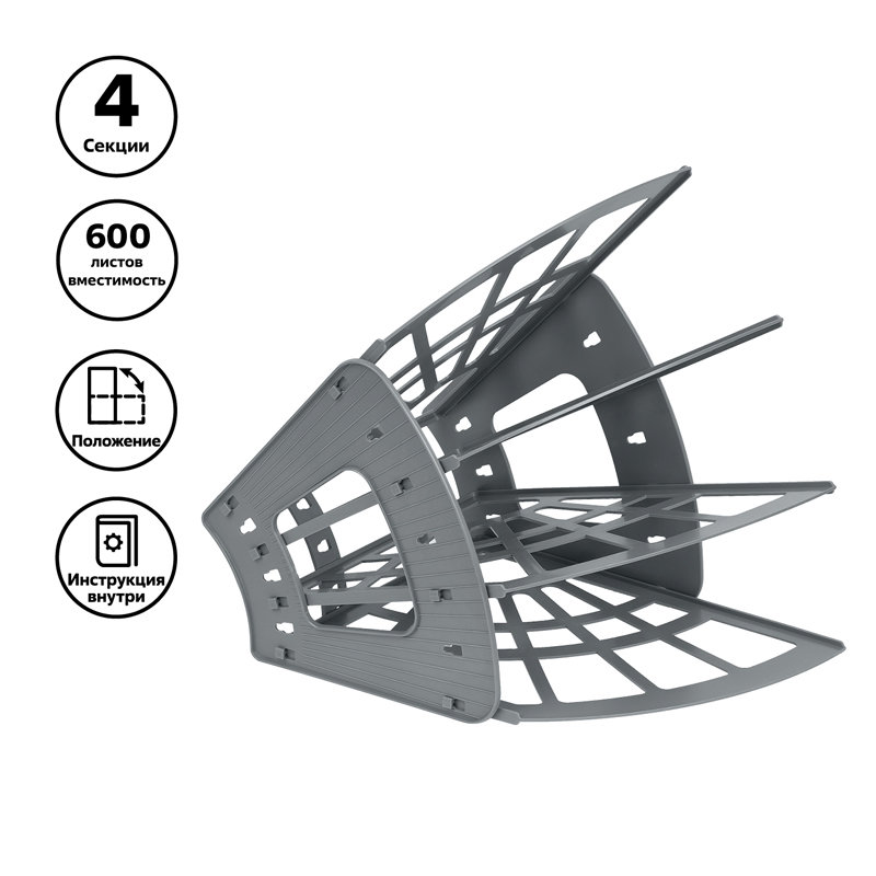 Лоток секционный 4 секции, 3 отделения для документации формата А4. Возможность горизонтального и вертикального расположения. Сборно-разборная, прочная, лёгкая конструкция. Конструкция позволяет регулировать ширину отделений. Экономичен при транспортировке и хранении.