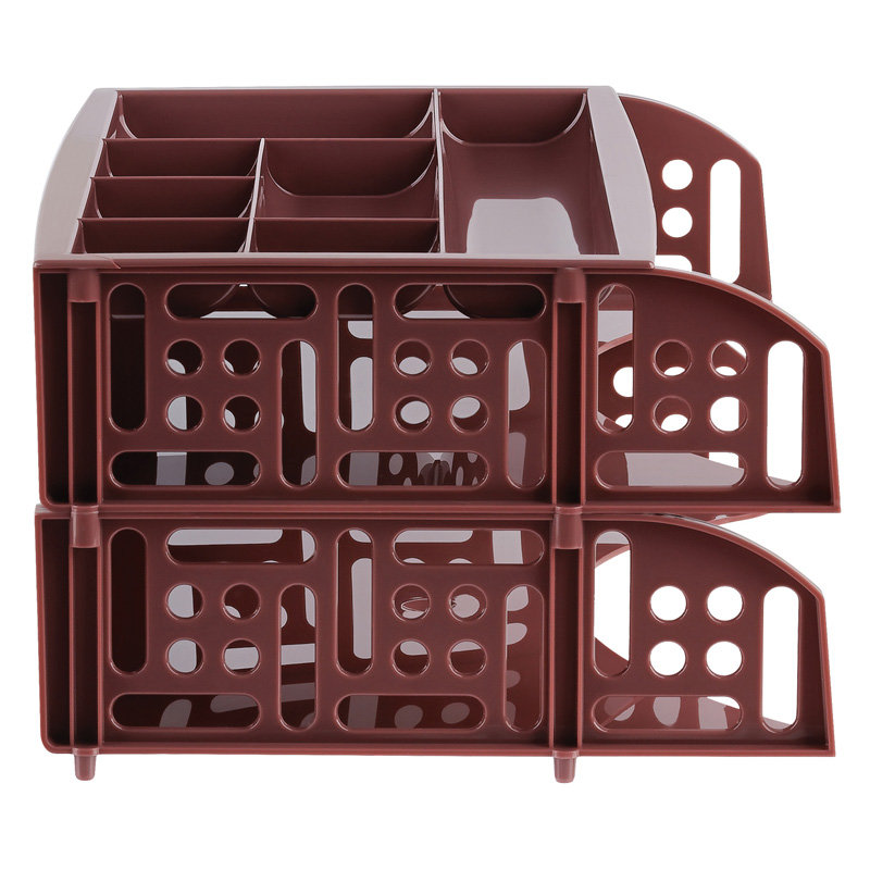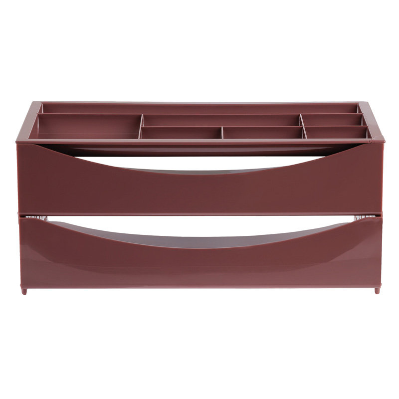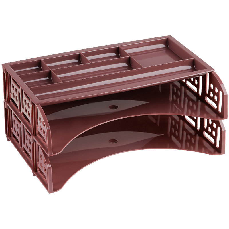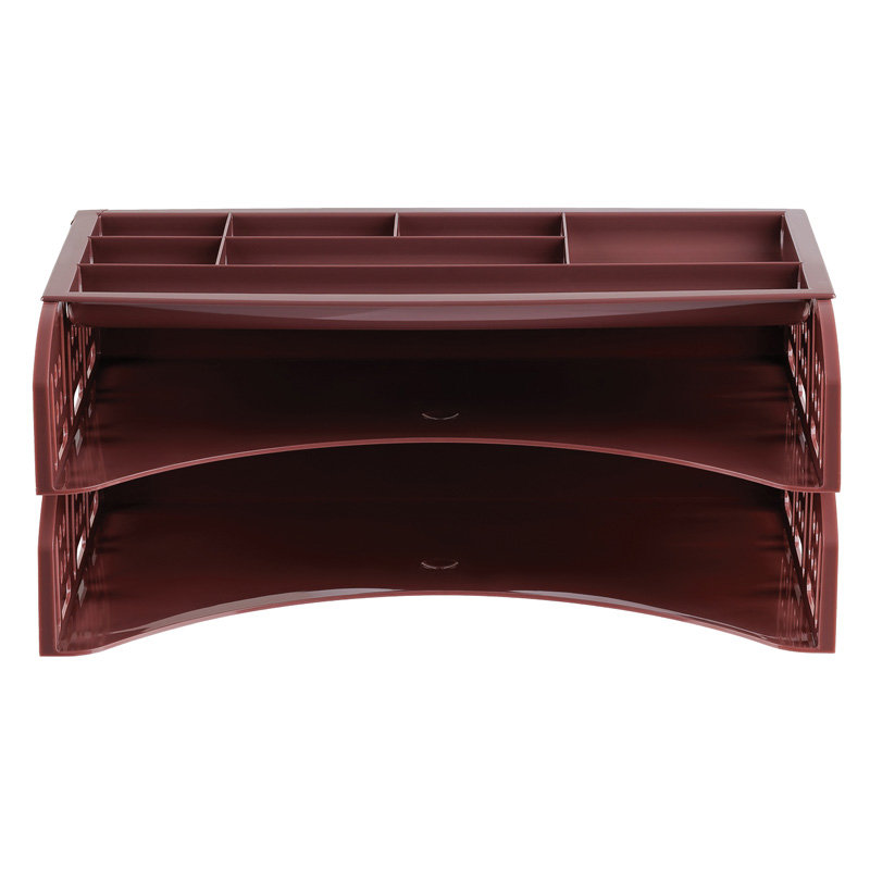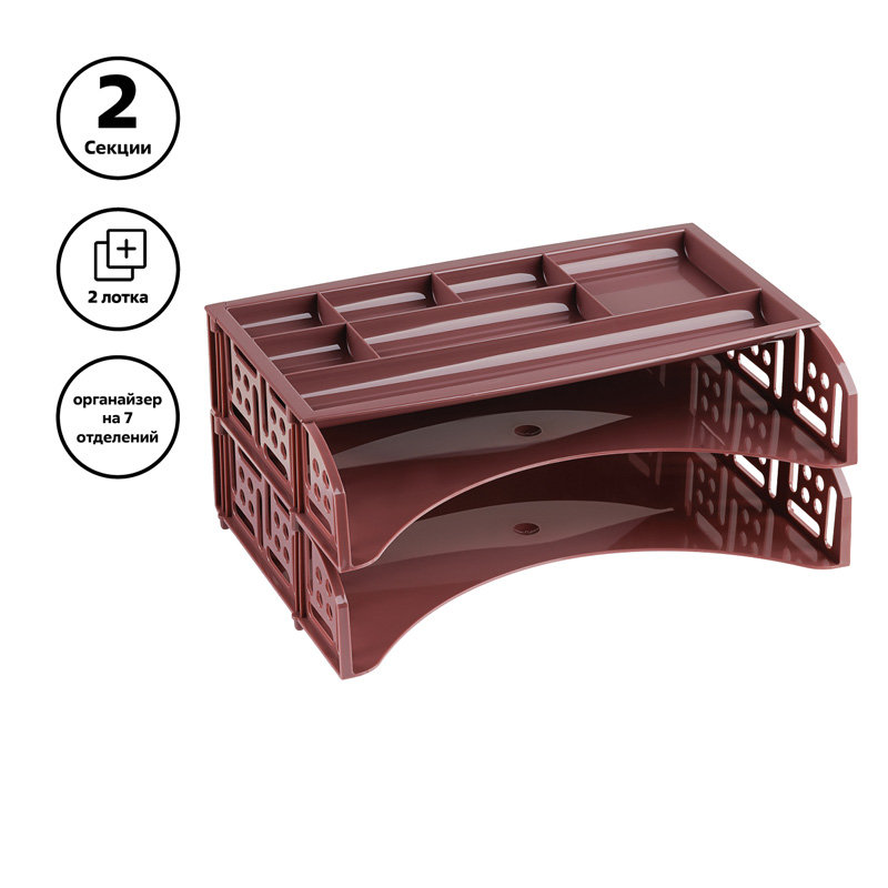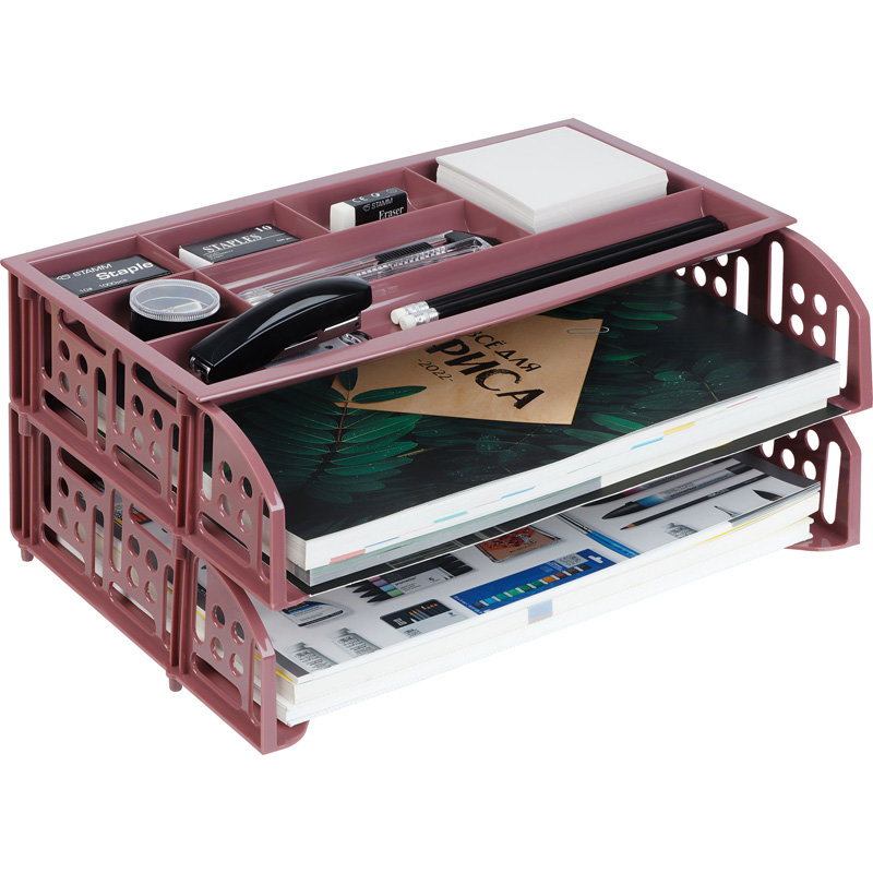Набор из 2-х лотков и органайзера FIELD эксклюзивного дизайна. Лотки надежно с фиксацией устанавливаются друг на друга. Форма органайзера позволяет располагать его с фиксацией на верхнем лотке. Органайзер имеет 7 отделений разных размеров для канцелярских принадлежностей. Габариты изделия в сборке: 230х335х150мм. Экономичная транспортировка и хранение.