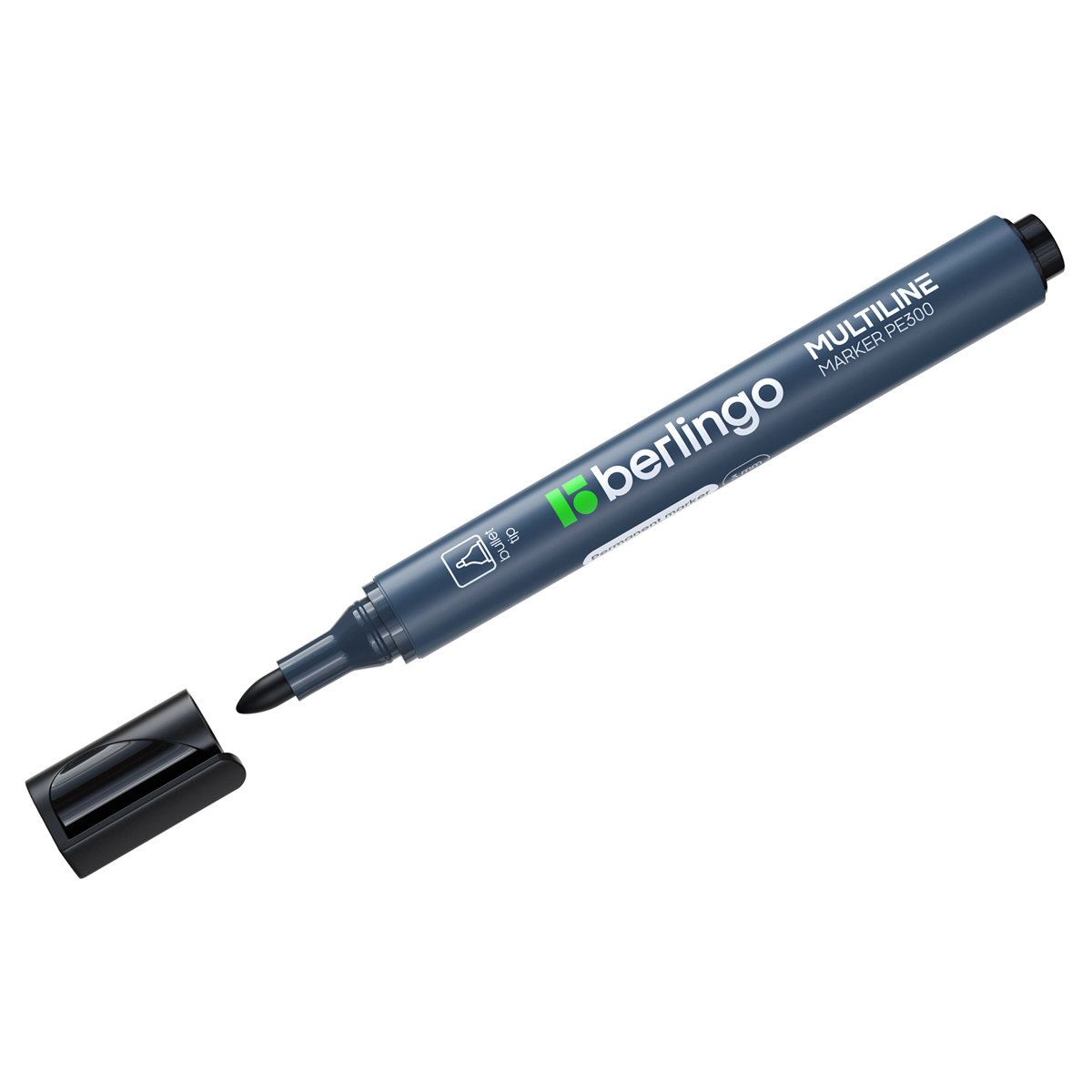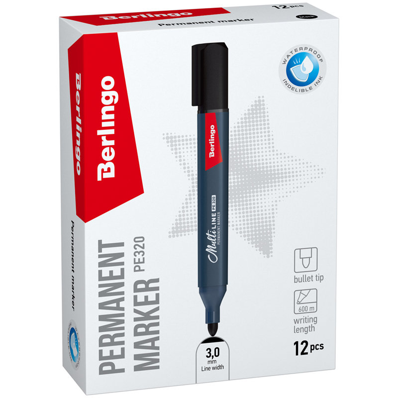Перманентный маркер на спиртовой основе. Предназначен для письма на большинстве поверхностей: бумаге, коже, пластмассе, металле, резине, ткани. Устойчив к стиранию, воде, свету, температурным и атмосферным воздействиям. Толщина линии 3мм. Цвет чёрный.