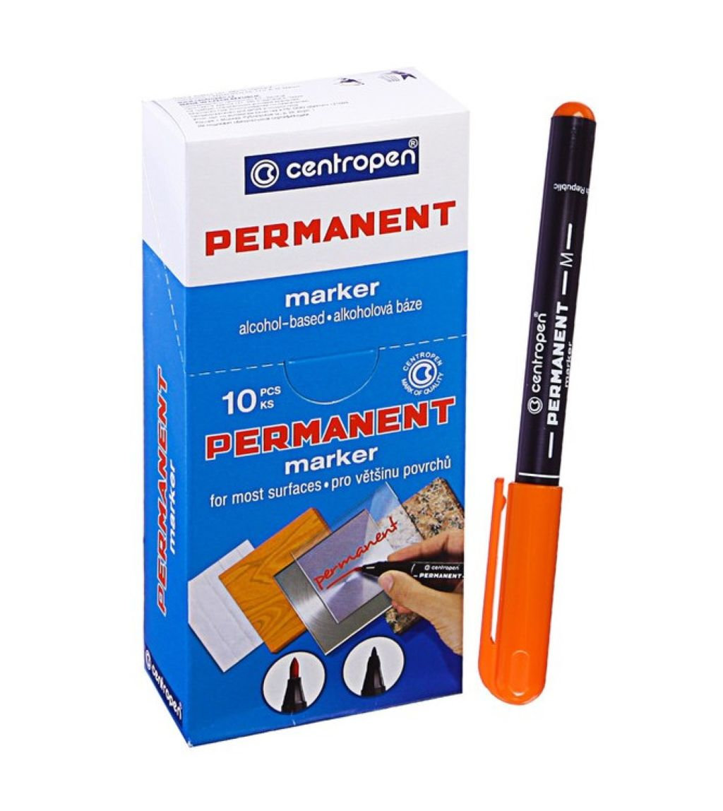 Перманентный маркер, оранжевый. Предназначен для письма на большинстве поверхностей. Чернила на спиртовой основе, термостойкие (до 100°C). Устойчивый к воде, стиранию, атмосферным воздействиям. Пулевидный наконечник, толщина линии 1 мм.