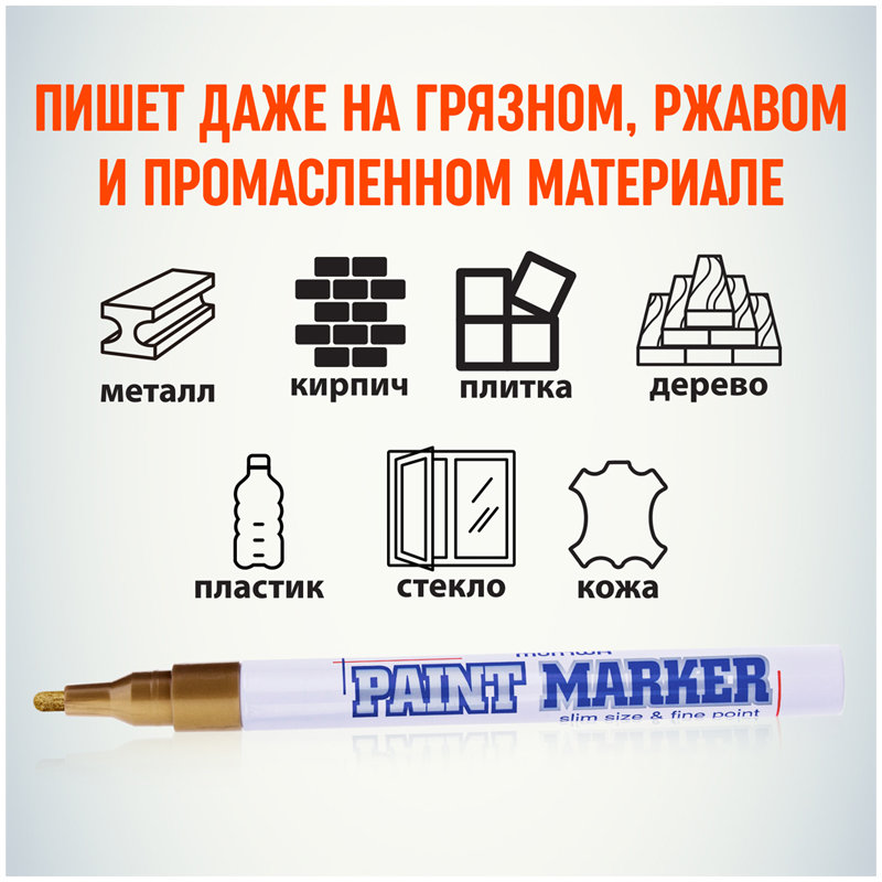 Водостойкая краска "MunHwa" на нитрооснове не поддается атмосферным воздействиям и широко применяется в производстве для маркировки изделий из пластика, дерева, металла, камня, стекла, резины. За счет нитрокраски, которая является наполнением данного вида маркеров изображение, нанесенное на поверхность быстро засыхает, и не смывается. Подвижный наконечник-дозатор регулирует поступление краски.