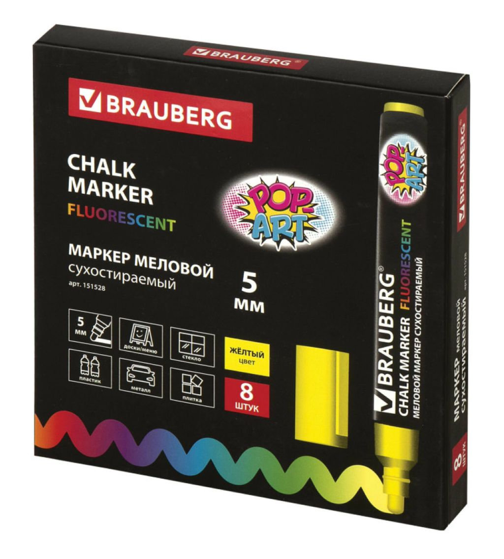 Сухостираемый меловой маркер BRAUBERG "POP-ART" - оригинальный инструмент для оформления различных зон помещений. Идеален для использования на школьных занятиях и детского творчества.
