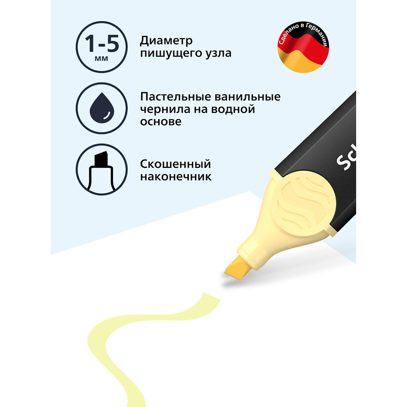 Универсальный текстовыделитель для различных типов бумаги. Скошенный наконечник позволяет проводить линии шириной 1-2 или 5 мм. Светостойкие чернила нежного пастельного цвета для самого важного в тексте.