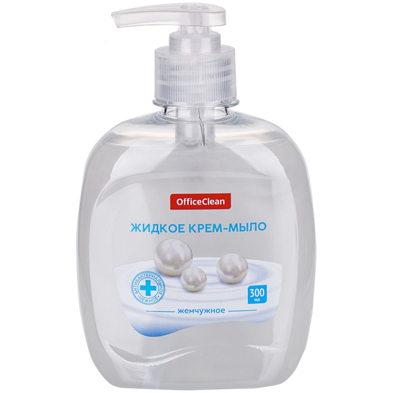 Мыло-крем жидкое OfficeClean "Жемчужное", антибактериальное, с дозатором, 300мл. Эффективно очищает, увлажняет, придаёт мягкость коже рук. Специальные компоненты дополнительно питают кожу рук во время мытья.