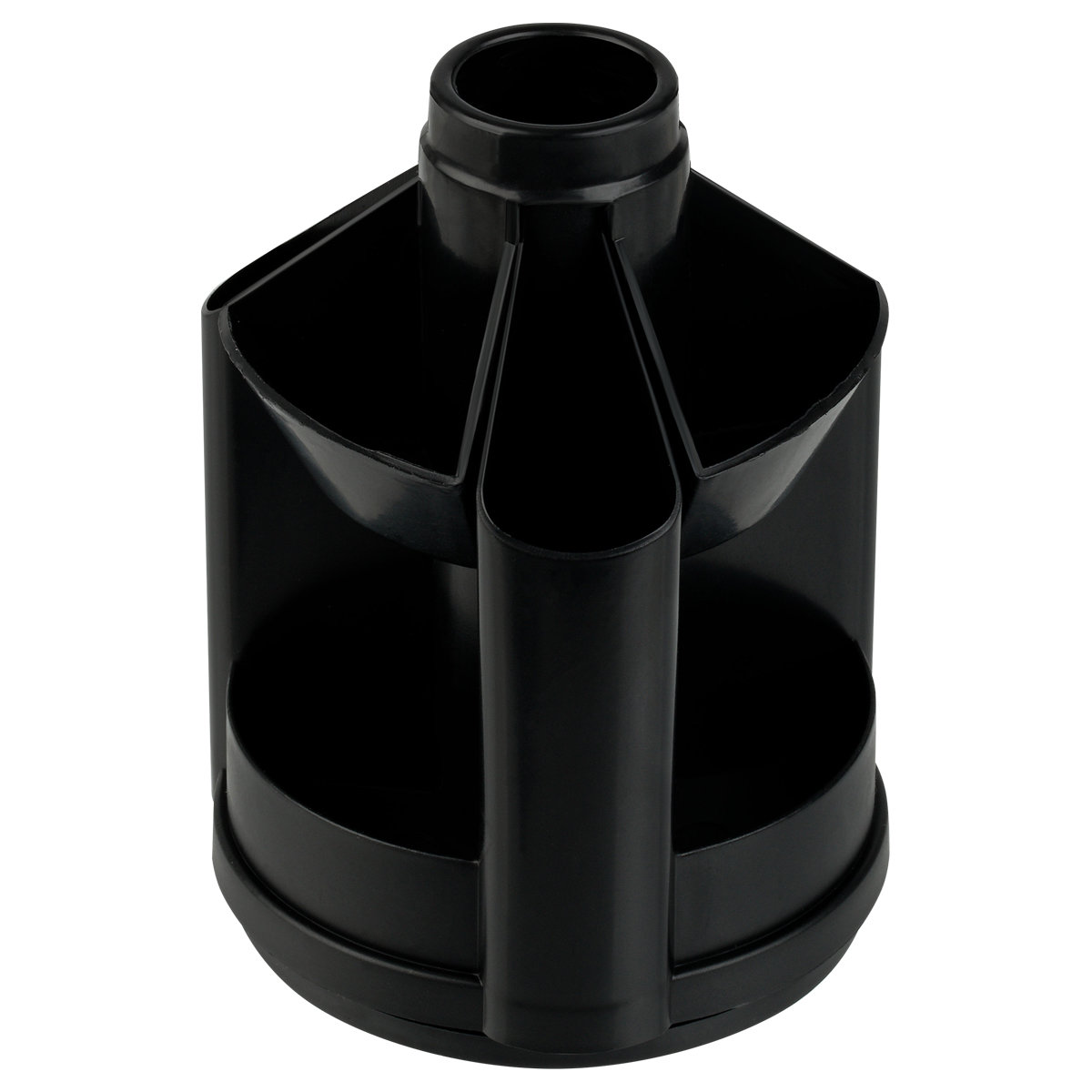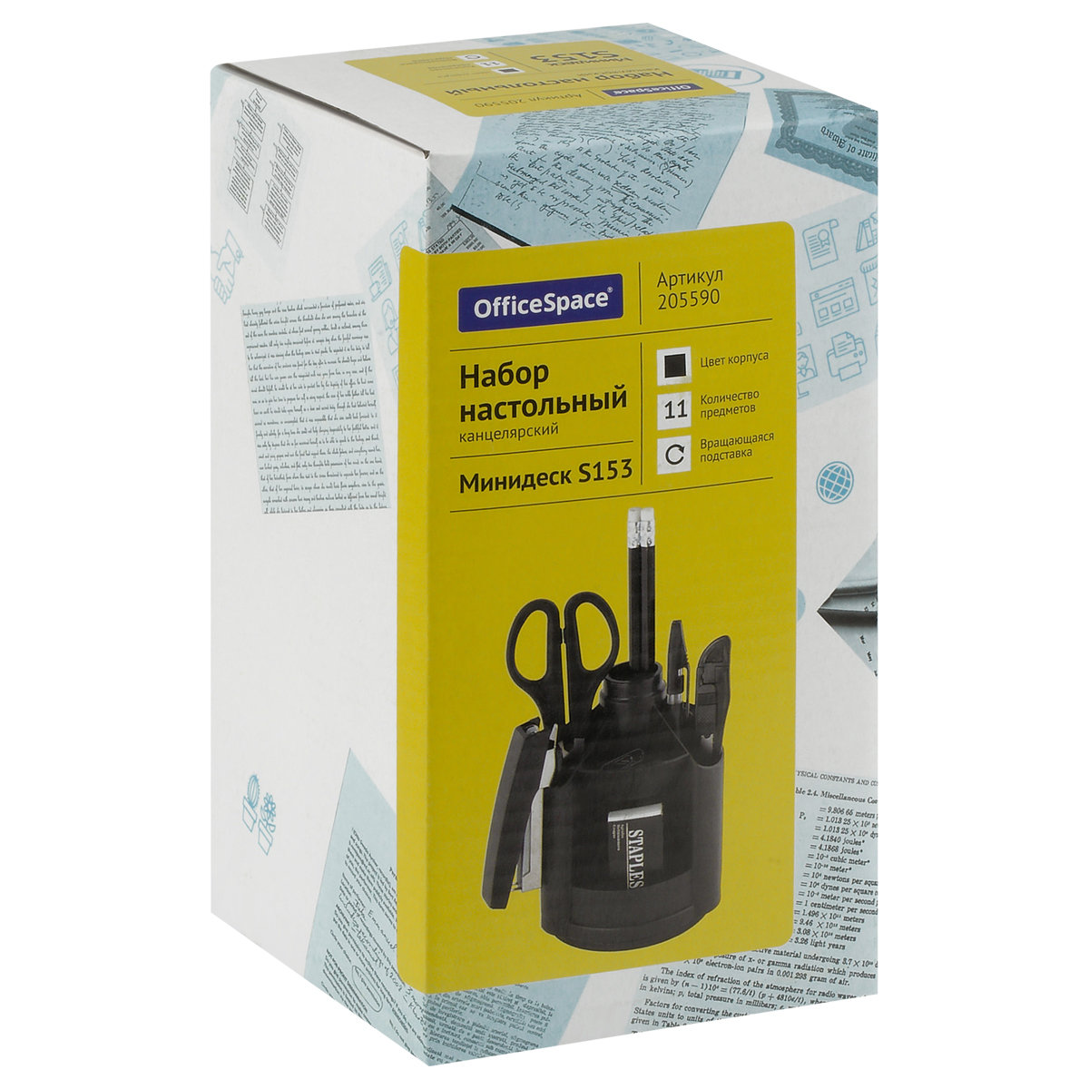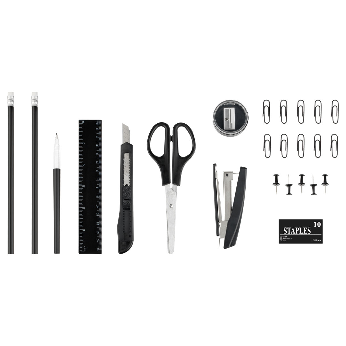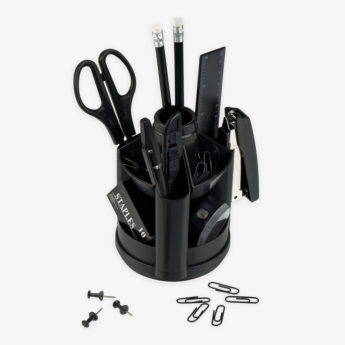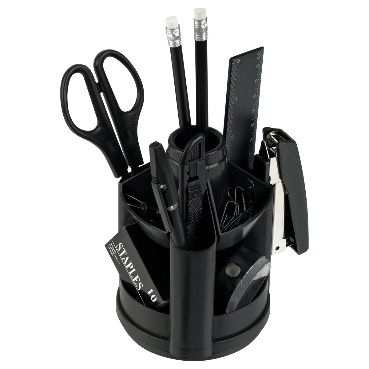 Настольный набор Erich Krause "Mini Desk" - незаменимый атрибут рабочего стола. Набор содержит черную пластиковую подставку на вращающейся основе и оптимальный набор самых необходимых канцелярских принадлежностей: ножницы, 2 чернографитных карандаша с ластиками, двойную точилку для карандашей, линейку на 15 см, степлер, 2 шариковых ручки, ластик, набор из 30 металлических скрепок с покрытием, канцелярский ножик, скобы для степлера (№10).