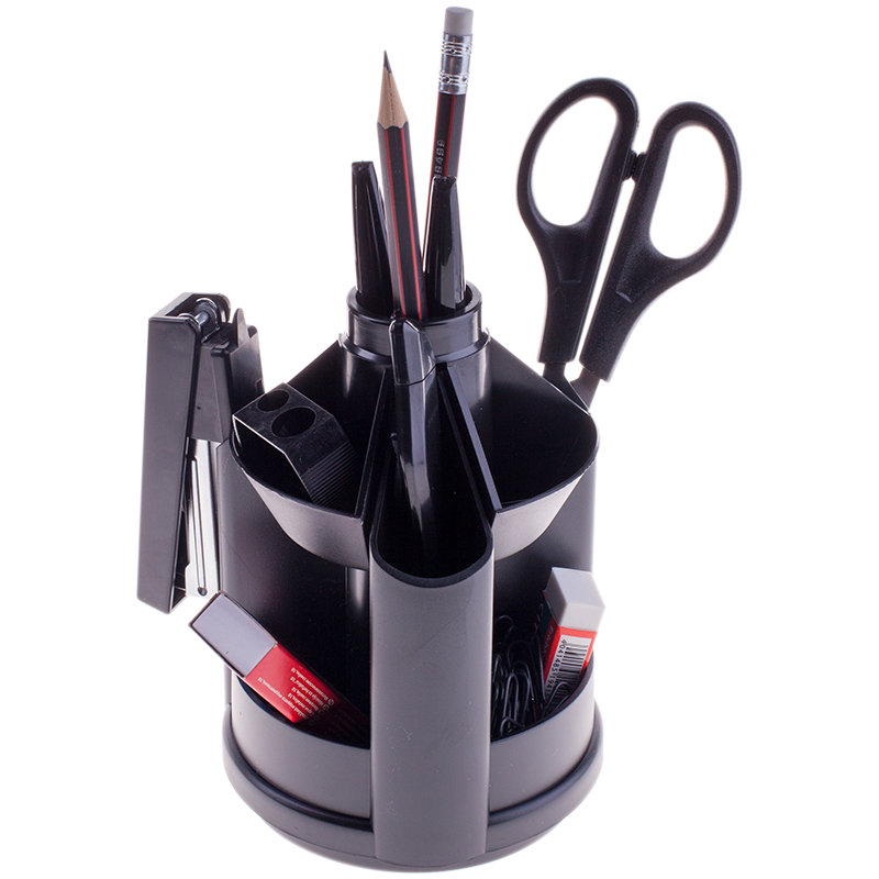 Канцелярский набор состоит из 12 предметов: подставка для пишущих принадлежностей, 2 ручки, 2 карандаша, ластик, линейка 15 см, ножницы, нож 9 мм, степлер №10, скобы №10, скрепки, точилка.