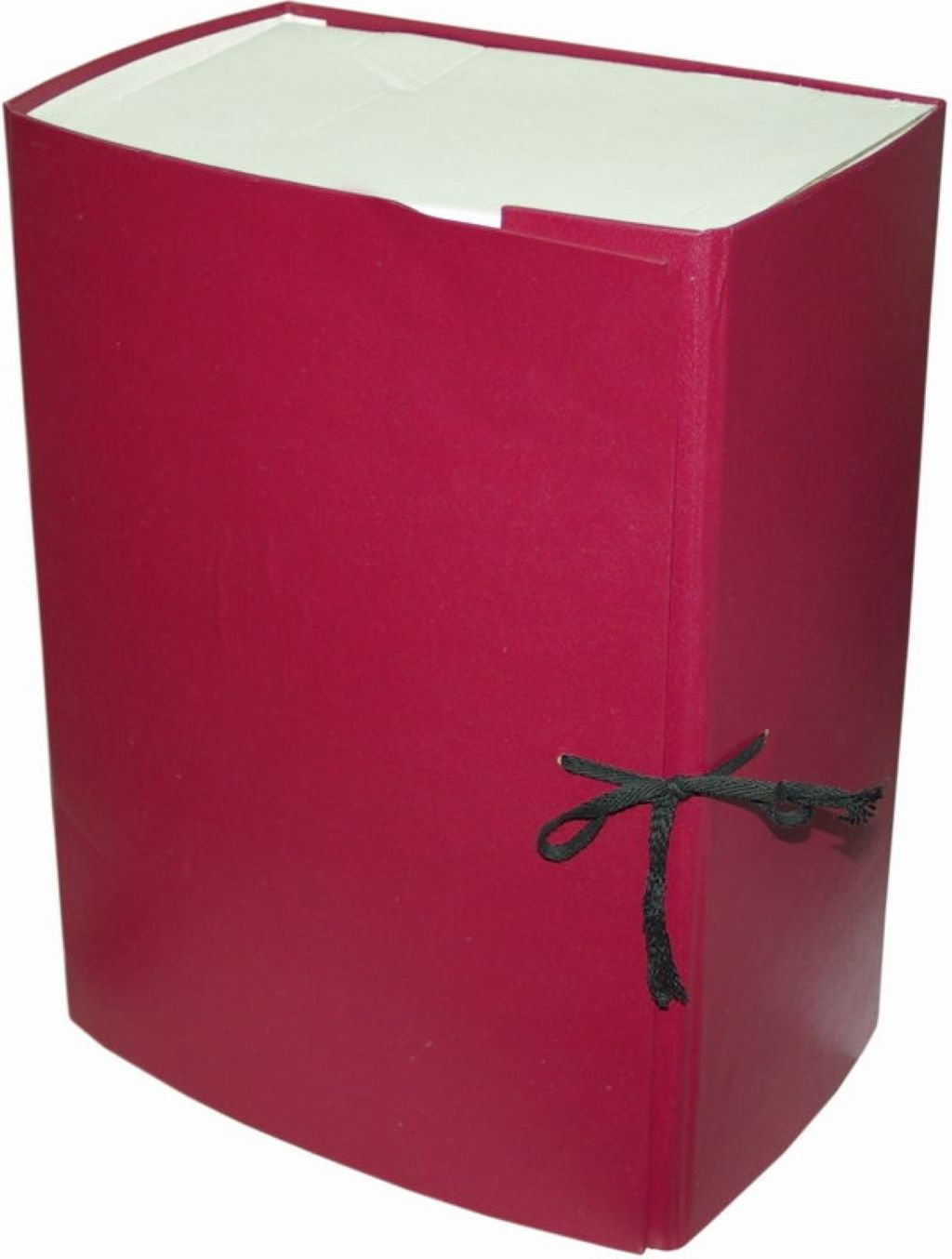 Архивный короб формата А4 изготовлен из переплетного картона, снаружи покрыт бумвинилом. В закрытом виде фиксируется с помощью хлопчатобумажных завязок.