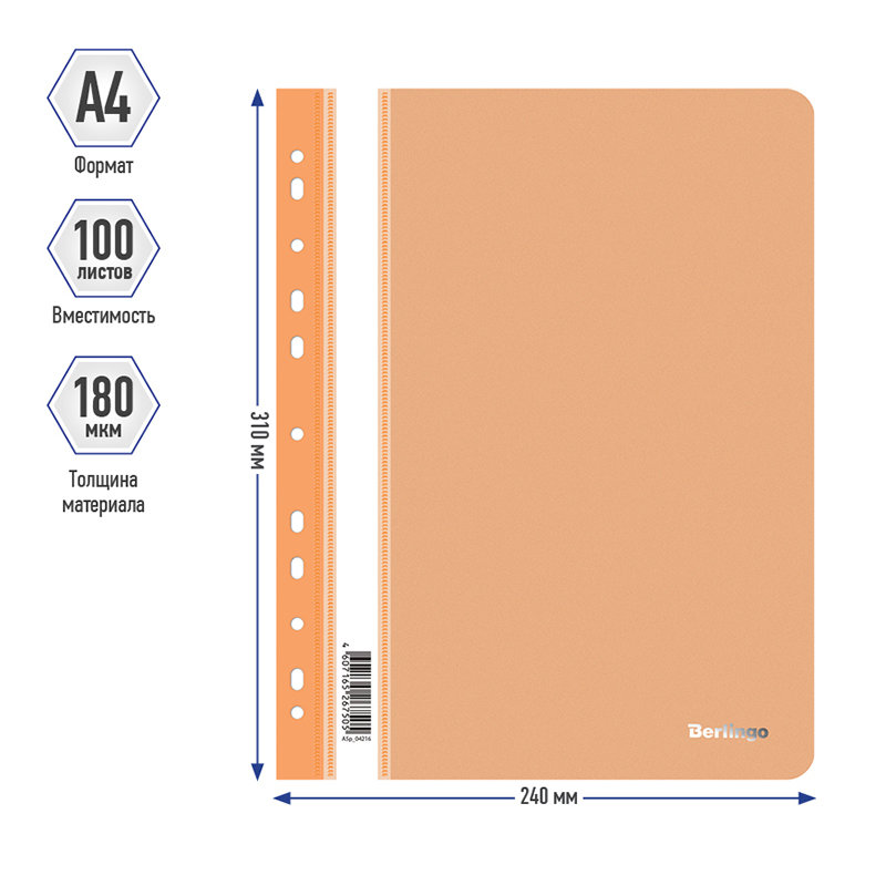 Папка-скоросшиватель формата А4 для хранения перфорированных листов.Перфорация для подшивки в папки на корешке. Имеет прозрачный титульный лист и усиленный корешок с прозрачным карманом для маркировки.
