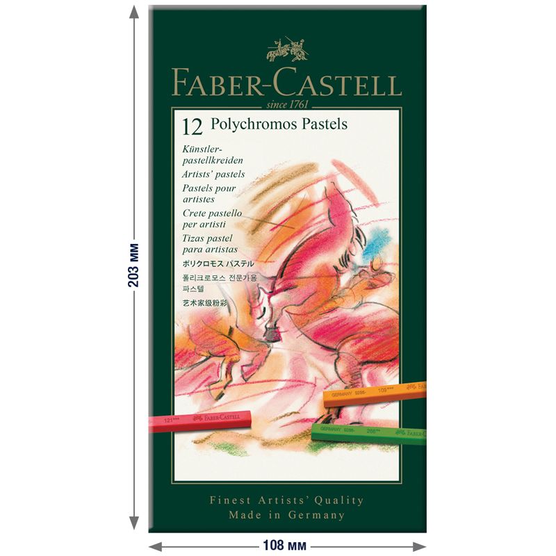 При изготовлении пастели "Polychromos" используются высококачественные пигменты, обладающие непревзойденной светостойкостью. Это единственный вид сухой твердой пастели, на каждом мелке которой обозначен уровень светостойкости. Рисунок, выполненный этой пастелью, легко поддается растиранию пальцами, растушевкой или кистью с уайт-спиритом. Цвета ложатся мягко как на гладкую, так и на фактурную бумагу и дают превосходную передачу тонов. Пастель имеет квадратную форму поперечного сечения. Используйте острые грани для прорисовки тонких деталей, а плоскую часть для заполнения больших участков работы. Рекомендуется легкая фиксация работы после завершения.
