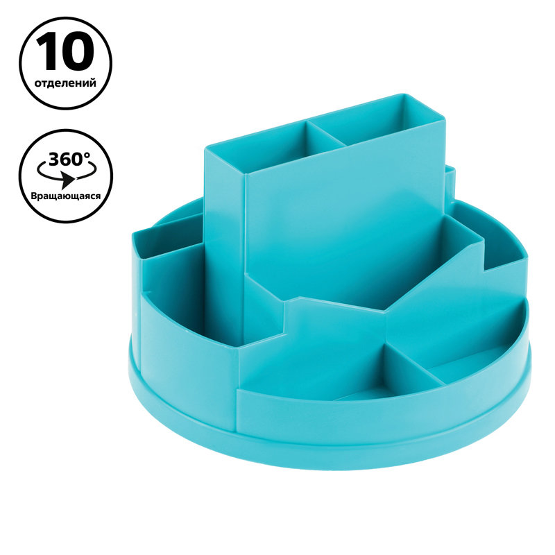 Большой, вместительный, удобный органайзер позволяет разместить все необходимые канцелярские принадлежности на рабочем столе. Содержит 10 отделений, в том числе - отделения для визиток и листков для записей. Легкое вращение на 360 градусов. Поставляется в нескольких вариантах цвета.