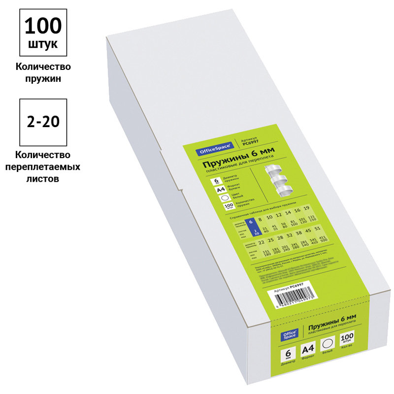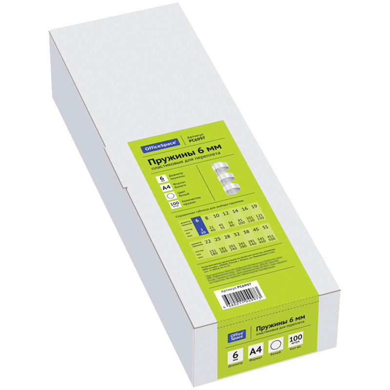 Пластиковые пружины OfficeSpace белого цвета диаметром 6мм предназначены для переплета документов. Легко выдерживают многократное раскрытие при необходимости добавить или удалить листы из готовой брошюры. Рекомендуемый объем брошюры при использовании данного диаметра пружины: 2-20 листов.