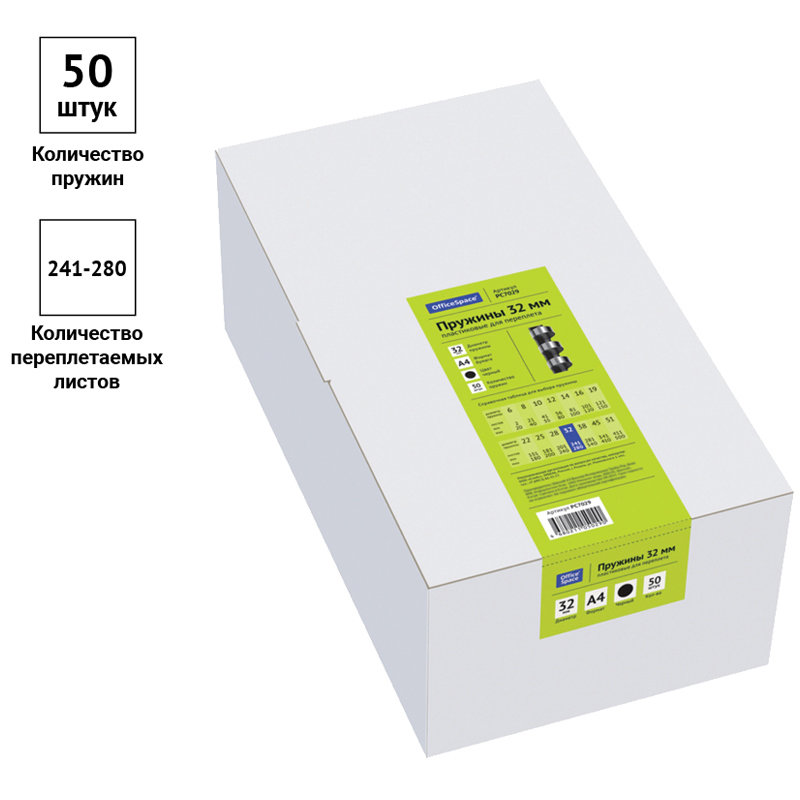Пластиковые пружины OfficeSpace белого цвета диаметром 32мм предназначены для переплета документов. Легко выдерживают многократное раскрытие при необходимости добавить или удалить листы из готовой брошюры. Для надежной фиксации листов брошюры в пружине предусмотрены специальные блокирующие замки. Рекомендуемый объем брошюры при использовании данного диаметра пружины: 241-280 листов.