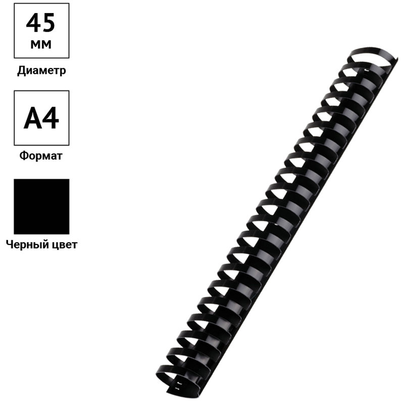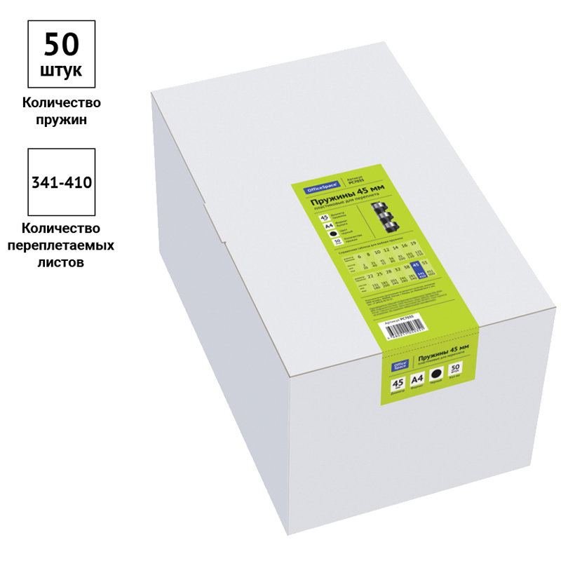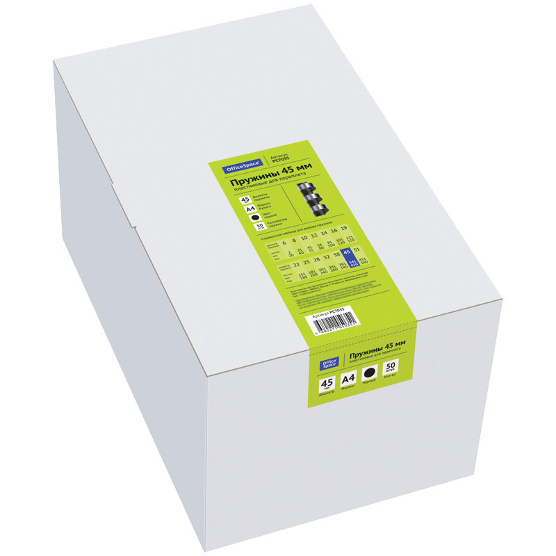 Пластиковые пружины OfficeSpace черного цвета диаметром 45мм предназначены для переплета документов. Легко выдерживают многократное раскрытие при необходимости добавить или удалить листы из готовой брошюры. Для надежной фиксации листов брошюры в пружине предусмотрены специальные блокирующие замки. Рекомендуемый объем брошюры при использовании данного диаметра пружины: 341-410 листов.