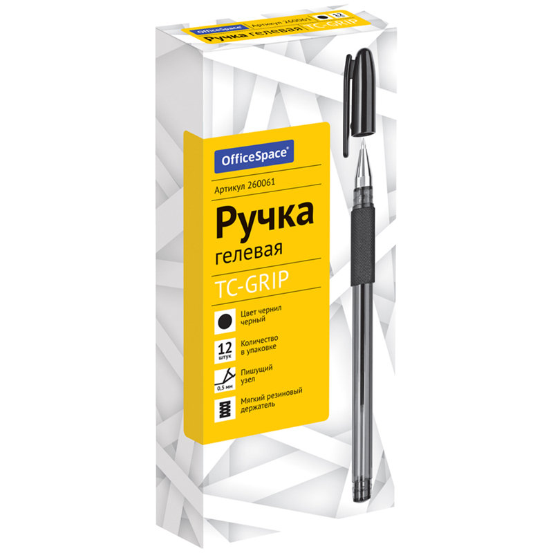 Гелевая ручка OfficeSpace TC-Grip с черными чернилами – это удобство в использовании и отличное качество. Внутри ручки в тонированном пластиковом корпусе – гелевые чернила, которые ярко пишут на бумаге. Резиновый грип препятствует скольжению при письме. Есть колпачок с клипом – можно закрепить ручку на одежде или тетради. Диаметр пишущего узла 0,5 мм, благодаря чему получается тонкая и аккуратная линия.