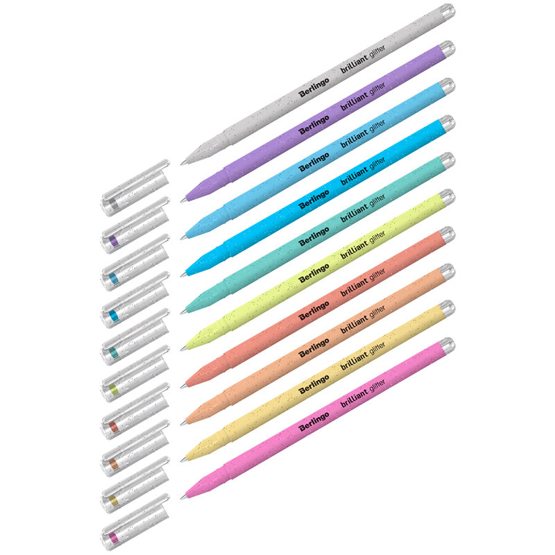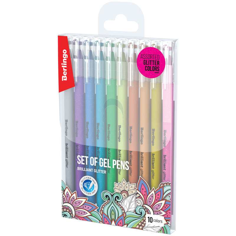Набор гелевых ручек Berlingo Brilliant Glitter из 10 цветов с блёстками (золото, серебро, жёлтый, зелёный, кирпичный, оранжевый, розовый, голубой, синий, фиолетовый) понравится, кто ценит всё эффектное и необычное. Ручки изготовлены с использованием корейских чернил, которые обеспечивают высокое качество письма и срок годности 2 года. Бархатистое покрытие Soft touch создаёт дополнительный комфорт при использовании. Цвет корпуса каждой ручки соответствует цвету чернил. Диаметр пишущего узла составляет 1 мм и обеспечивает мягкость письма и насыщенность цвета. Толщина линии письма составляет 0,8 мм, длина линии письма - 450 метров.
