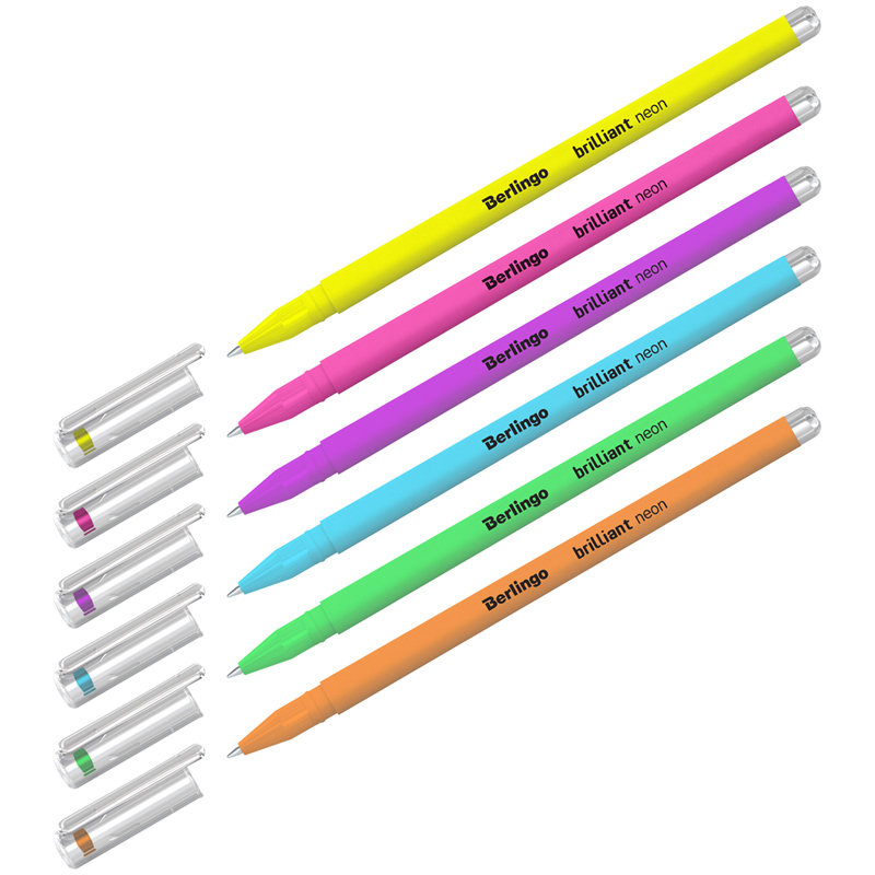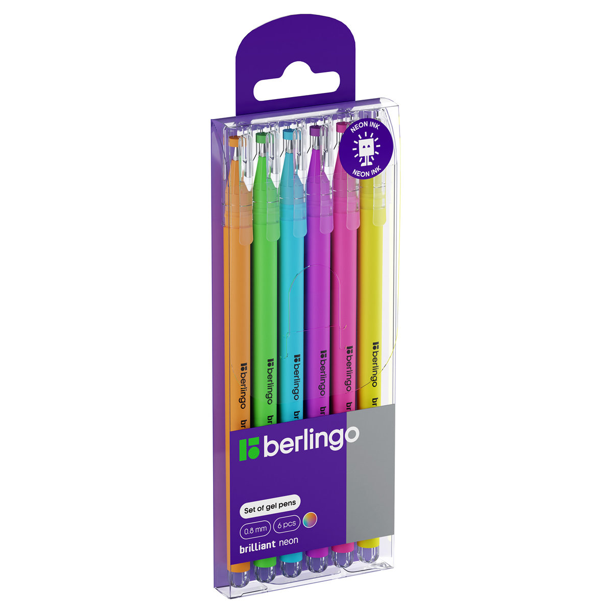Набор гелевых ручек Berlingo Brilliant Neon из шести неоновых цветов с флуоресцентным эффектом: жёлтый, зелёный, оранжевый, розовый, голубой и фиолетовый. Цвет корпуса каждой ручки соответствует цвету чернил. Бархатистое покрытие корпуса Soft touch гарантирует дополнительный комфорт. Использование в изготовлении ручки корейских чернил обеспечивает высокое качество письма и срок годности до 2-х лет. Диаметр пишущего узла ручки – 0,8 мм, что обеспечивает мягкое письмо и насыщенность цвета. Набор гелевых ручек упакован в пластиковый пенал с европодвесом.