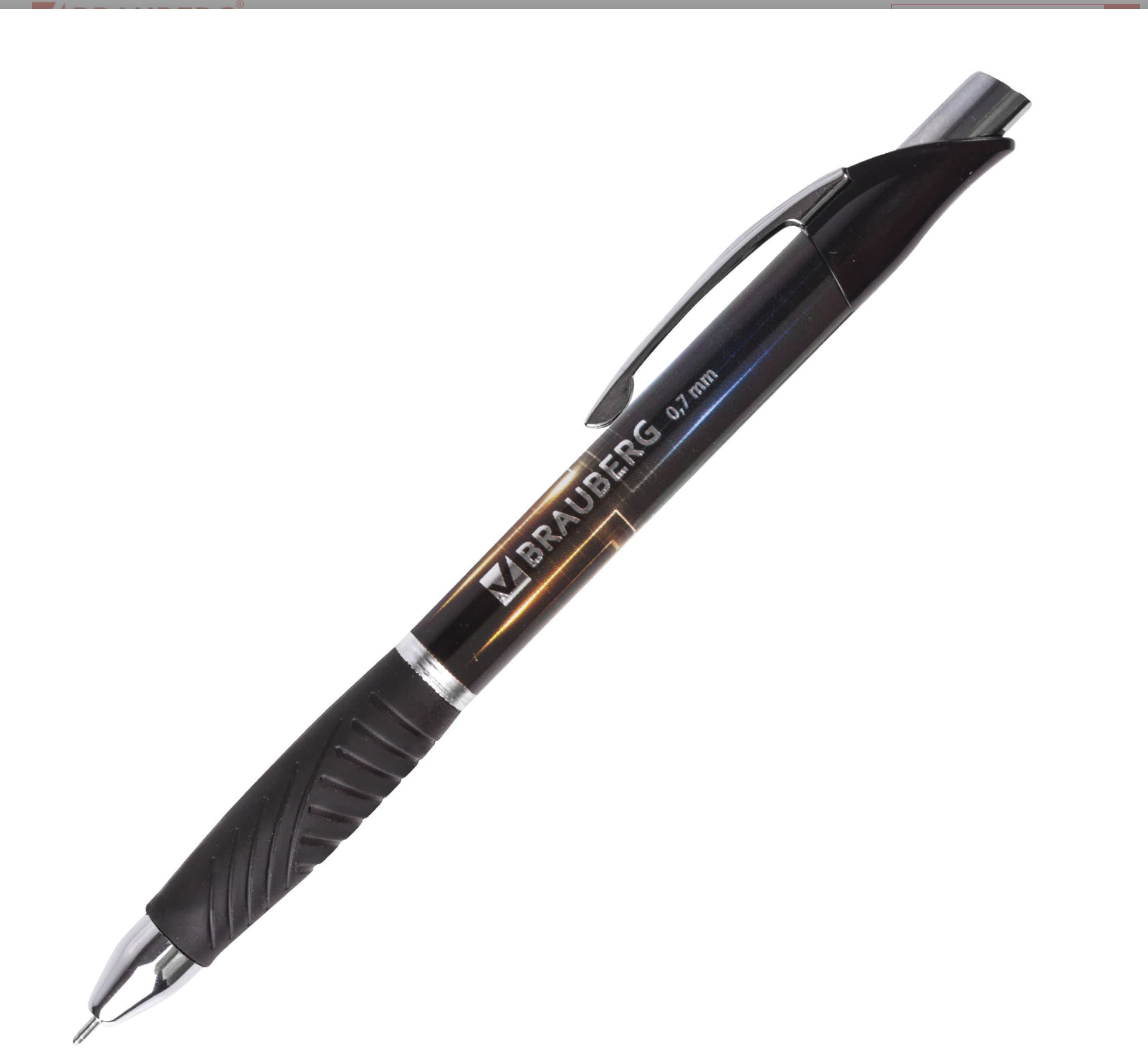 Имеет круглый корпус черного цвета с печатью и резиновым грипом в зоне захвата для удобства письма.