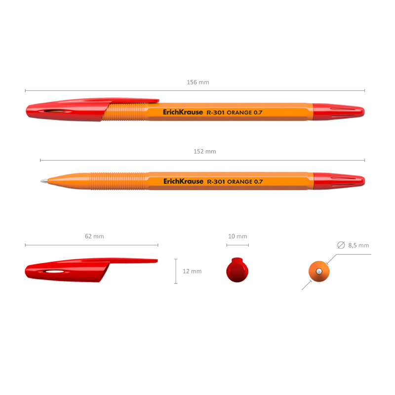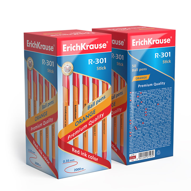 Классическая шариковая ручка Stick со стандартным типом пишущего узла и заменяемым стержнем. Ручка имеет непрозрачный оранжевый шестигранный корпус с удобной профилированной грип-зоной и вентилируемый колпачок. Цвет колпачка и заглушки соответствует цвету чернил. 5-канальный пишущий узел с диаметром шарика 0.7 мм в сочетании с быстросохнущими чернилами обеспечивает мягкое и быстрое письмо. Длина непрерывной линии составляет 2000 м при толщине 0.35 мм, что является одним из лучших показателей в своей категории. Модель R-301 Orange 0.7 Stick имеет узнаваемую запатентованную форму и стала одним из бестселлеров в ассортименте шариковых ручек ErichKrause® более чем в пятидесяти странах мира.