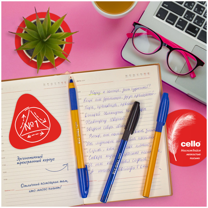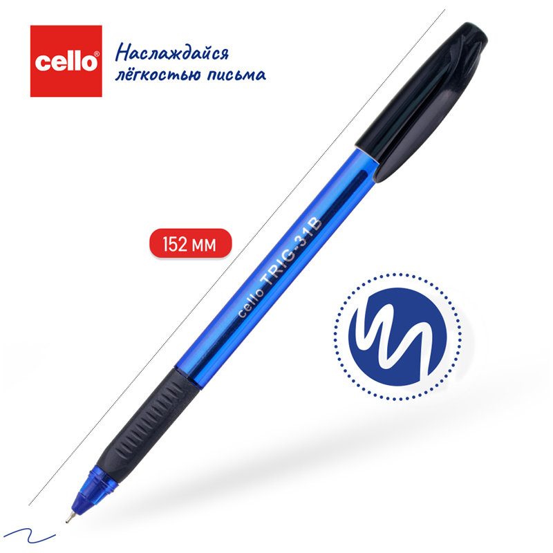 Шариковая синяя ручка Cello Tri-Grip blue barrel – сочетание трехгранной формы корпуса ручки и мягкого комфортного письма. Диаметр пишущего узла - 0,7 мм, благодаря чему ручка подходит для любого стиля письма. Она подойдет для заполнения бланков, ведения дневника, рисунков в скетчбуке. Чернила шариковой ручки на масляной основе пониженной вязкости с технологией письма Lubriflow обеспечивают гладкое и мягкое письмо при минимальном нажатии. Безопасный вентилируемый колпачок. Антибактериальный грип препятствует скольжению пальцев при письме. Игольчатый пишущий узел обеспечивает мягкое письмо в одно касание.