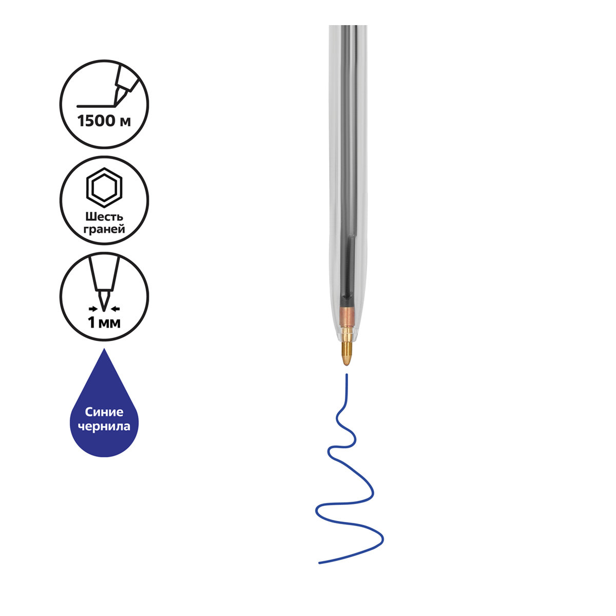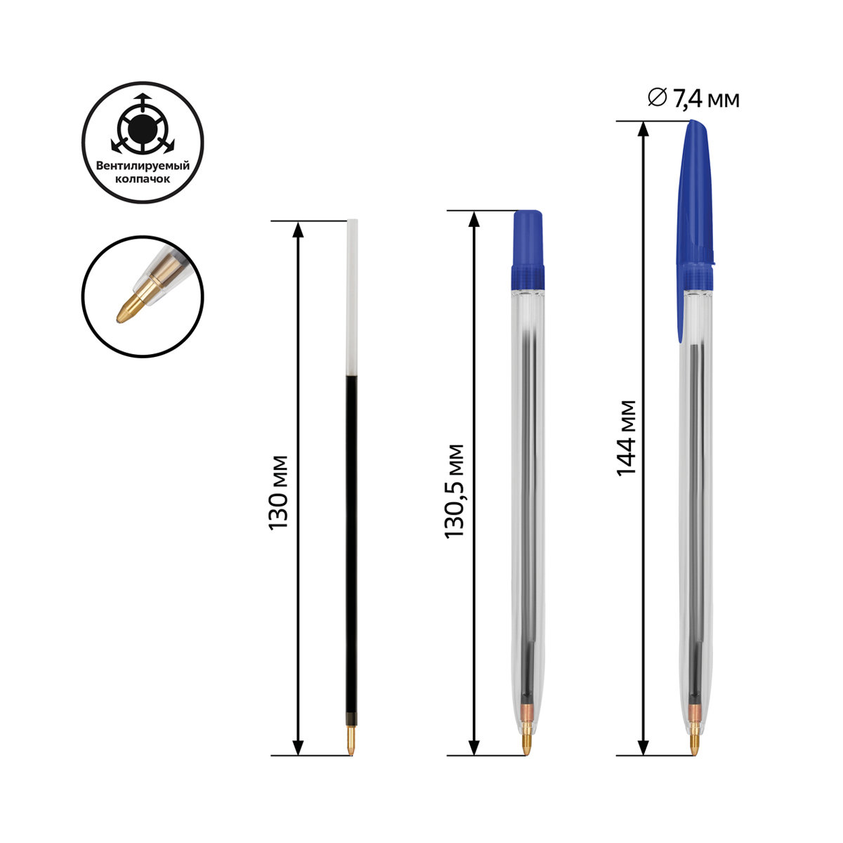 Ручка шариковая с синим стержнем. Вентилируемый колпачок. Толщина линии письма 1,0мм. Длина стержня 130мм. На каждой ручке имеется штрихкод.