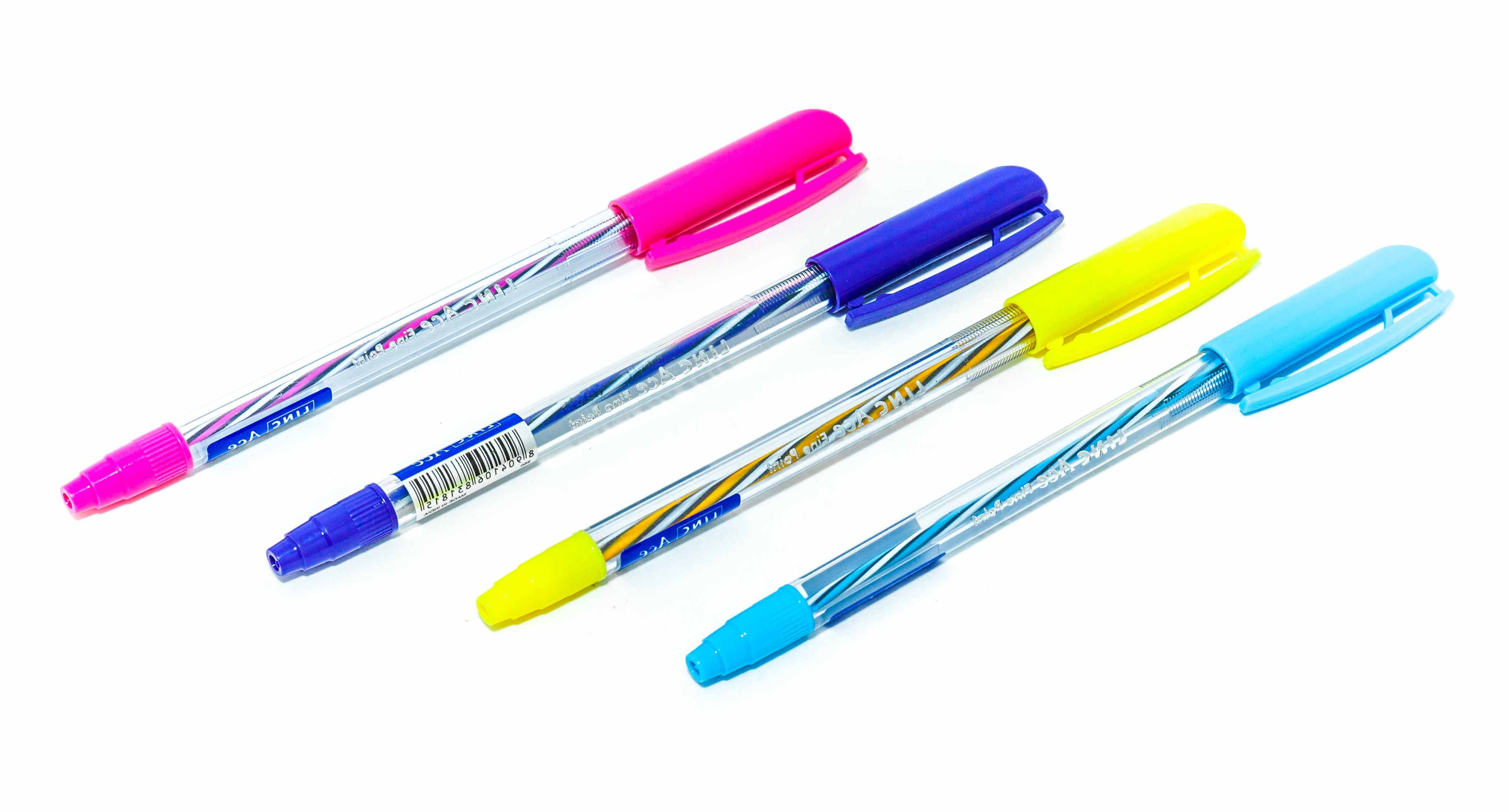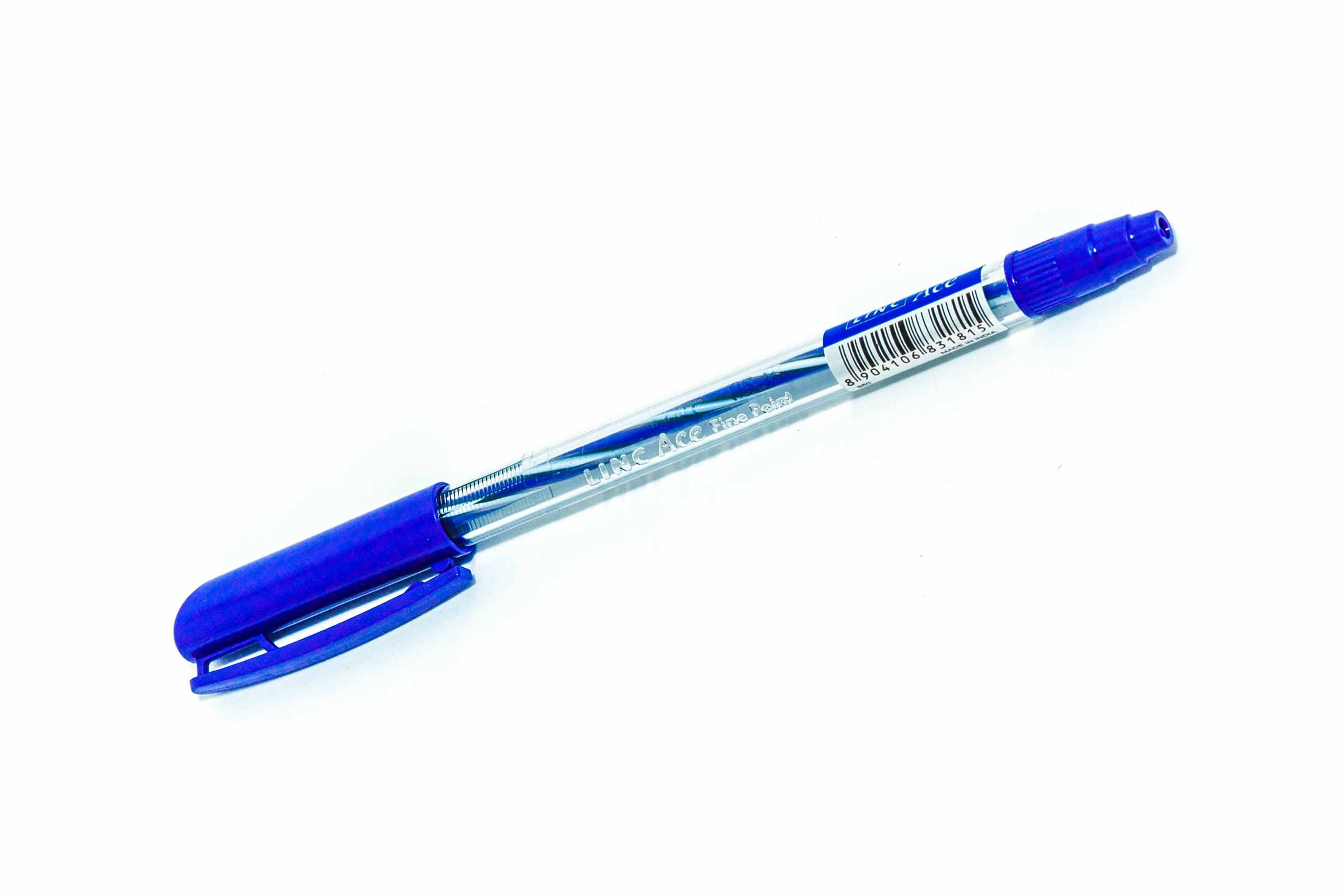 Ручка шариковая синяя "ACE". Корпус выполнен из прозрачного пластика с просвечивающимся через него ярким, полосатым стержнем. Наконечники и колпачки могут быть разных цветов. Тип пишущего наконечника - игла.