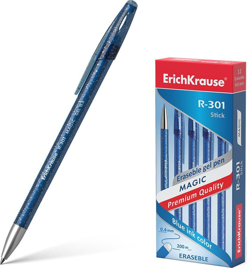 Гелевая ручка со стираемыми чернилами, стандартным типом пишущего узла и заменяемым стержнем. Ручка имеет полупрозрачный, тонированный круглый корпус с блестками, оснащенный заглушкой-ластиком.