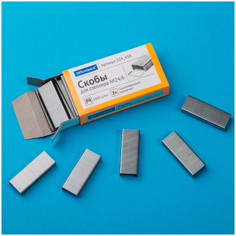 Скобы для степлеров OfficeSpace №24/6, оцинкованные. Упакованы в картонную упаковку.