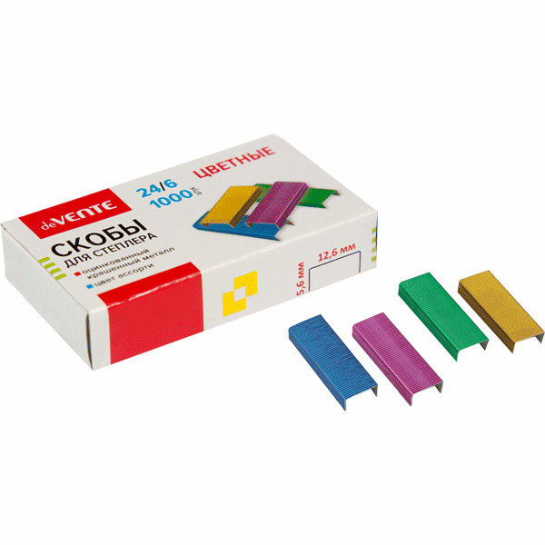 Скобы для степлера цветные "deVENTE" 24/6, 4 цвета ассорти, 1000 шт в картонной коробке