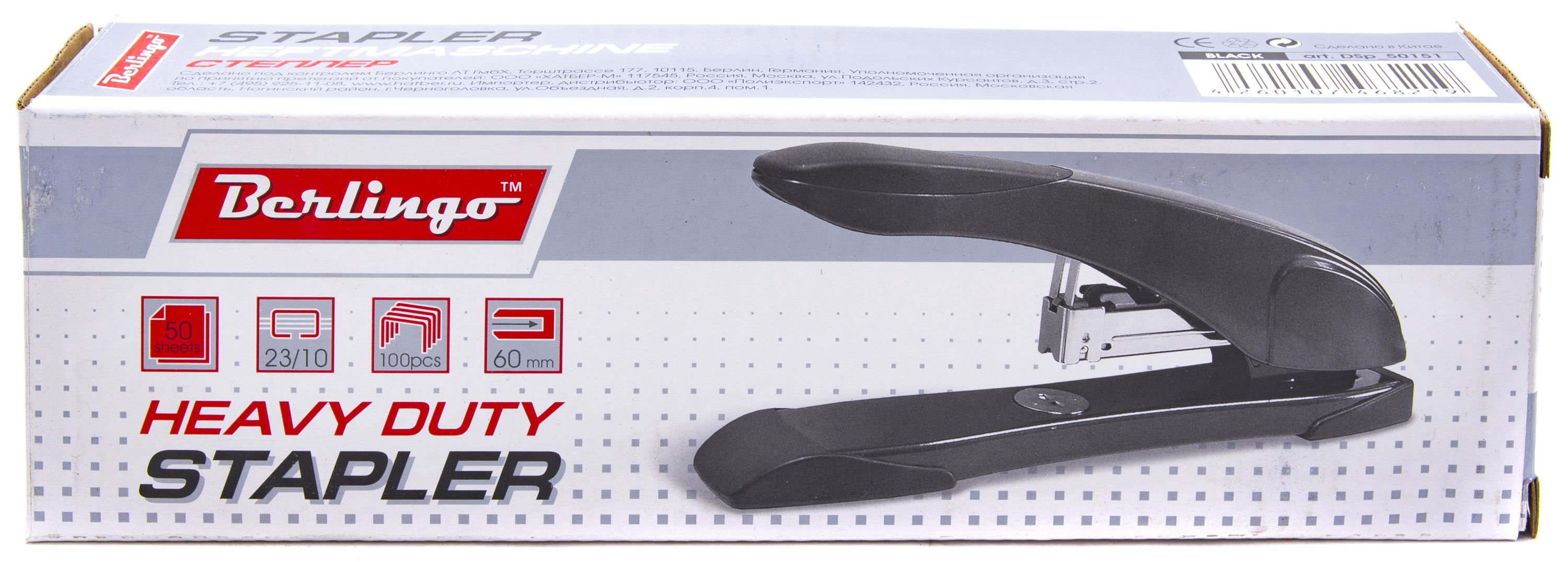Мощный степлер "Berlingo", предназначен для сшивания большого количества листов бумаги. Металлический корпус, верхняя накладка и накладки на основании - из пластика. Сшивает до 50 листов. Вмещает 100 скоб № 23/10. Глубина захвата - 60 мм.