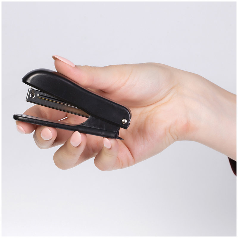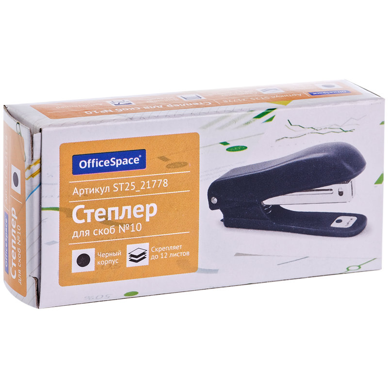 Удобный, пластиковый степлер для скоб №10, сшивает до 12 листов, вмещает 50 скоб, есть встроенный антистеплер.