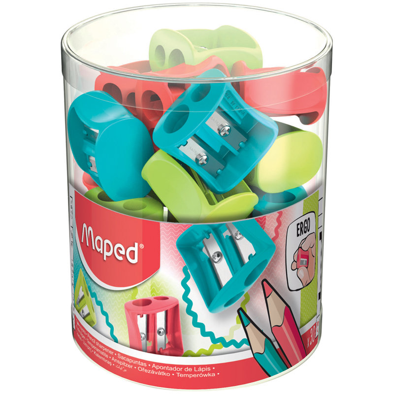 Точилка Maped с двумя отверстиями идеально подойдет для стандартных и утолщенных карандашей. В ассортименте представлены бирюзовый, коралловый и салатовый цвета.