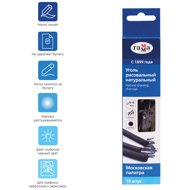 Уголь не царапает бумагу и мягко растушевывается. Легко ложится на различные текстуры бумаги, холста, оставляет на поверхности бархатное покрытие глубокого черного цвета.